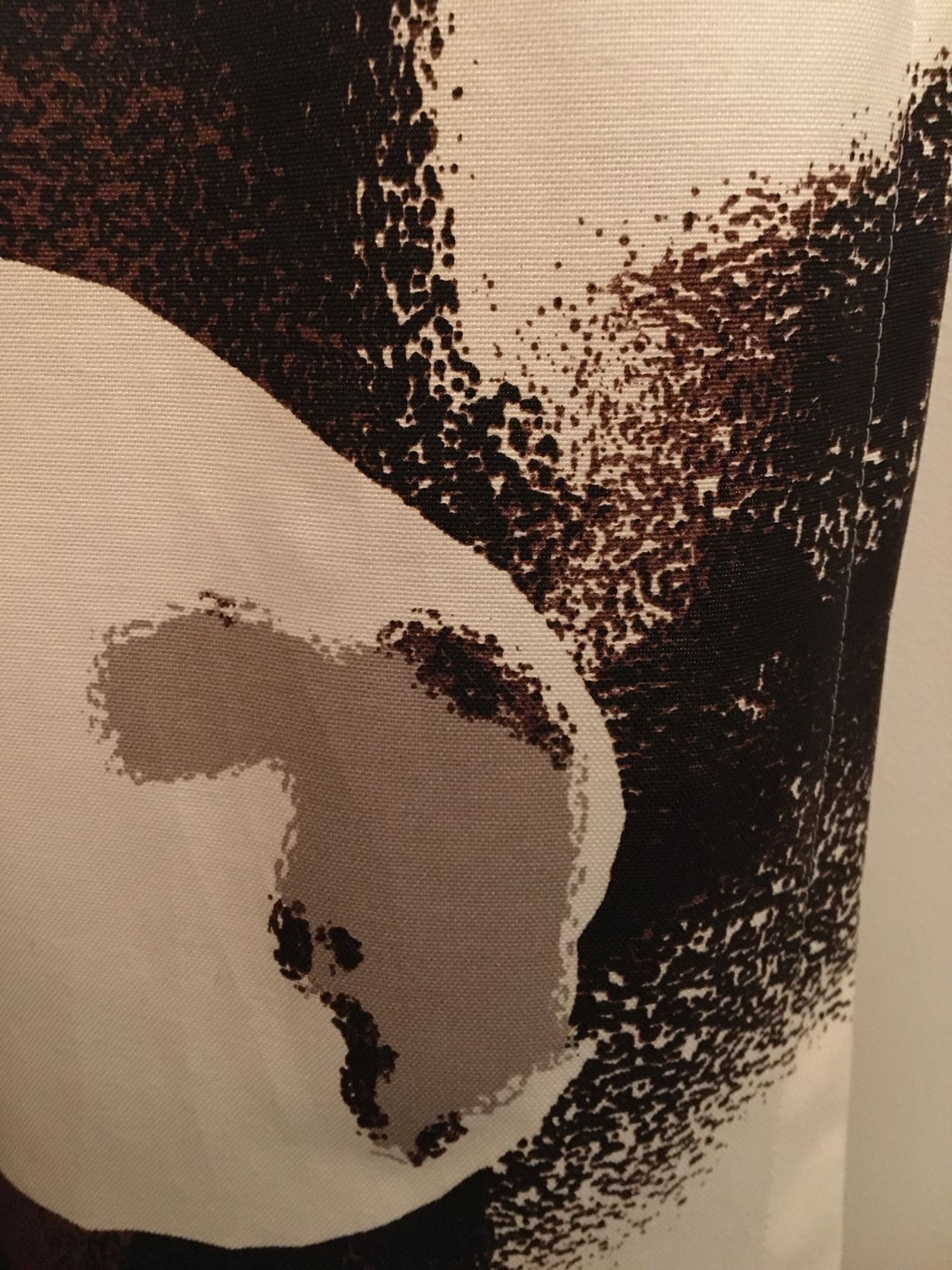 Tämä iso nenäisen miehen kasvot löytyvät makuuhuoneemme sivuverhosta. Sängyllä maatessani tämä kuvio osuu väistämättä silmääni. Hupaisan näköinen heppu.