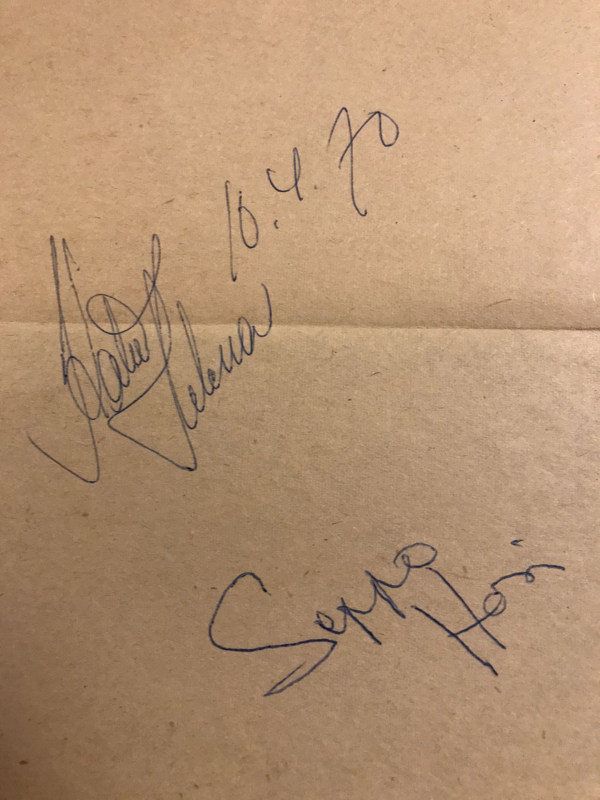 Nimmarin 50-vuotispäivä lähestyy. Katri Helena, säestäjänään Seppo Hovi, oli esiintymässä pienen kirkonkylän osuuskaupassa, jossa äitini oli myyjänä. Väliajalla Katri Helena teki ostoksia ja äitini palveli häntä. Nimikirjoitukset kirjoitettiin käärepaperiin ?