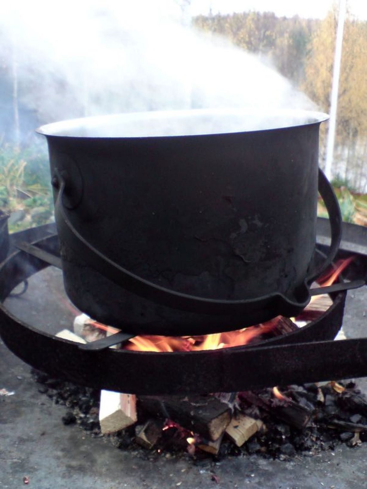 Tämä kattila on monet "liemet" nähnyt. mm. Hankien keskellä laskiais hernekeiton, keväällä korvasienet,kesällä uudet perunat ja vihannekset,kalakeiton, syksyllä rouskut ym. Kuvassa höyryää veriseitikkiliemi,ei kuitenkaan syötäväksi, vaan lankojen värjäystä varten.