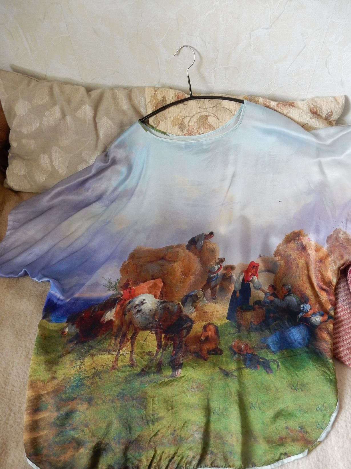 Sain rahaa synttärilahjaksi.Tein Kiinan matkan,josta ostin tämän silkkipuseron.Kuva heinätöistä tuo mieleen lapsuuden,jolloin olin itsekin heinäpellolla.