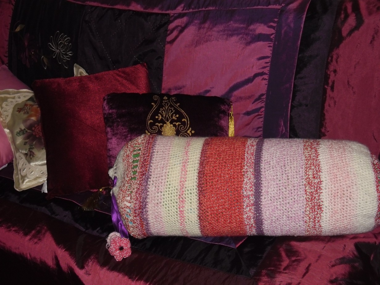 Virkkasin tämän pitkulan mallisen pussukan jämälangoista, Se toimii kauniina sohvatyynynä ja piilottaa kätevästi sisälleen varatäkin yövieraita varten.