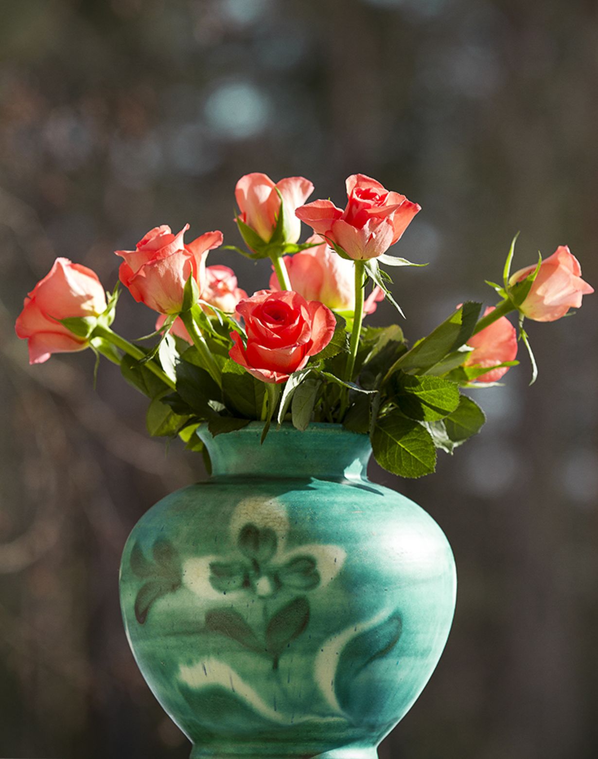 Tämän kukkamaljakon ovat vanhempani saaneet häälahjaksi 1940-luvulla äitini vanhemmilta. Nyt se ilahduttaa minua ruusuineen ja muistoineen.
