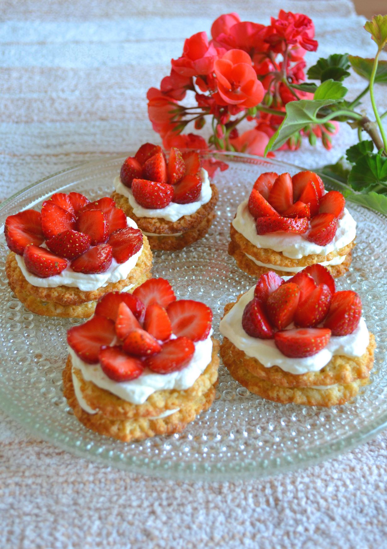 Lusikoi kermaa keksien päälle ja paina toinen keksi päälle. Laita kermaa keksin päälle ja asettele mansikoita päälle.