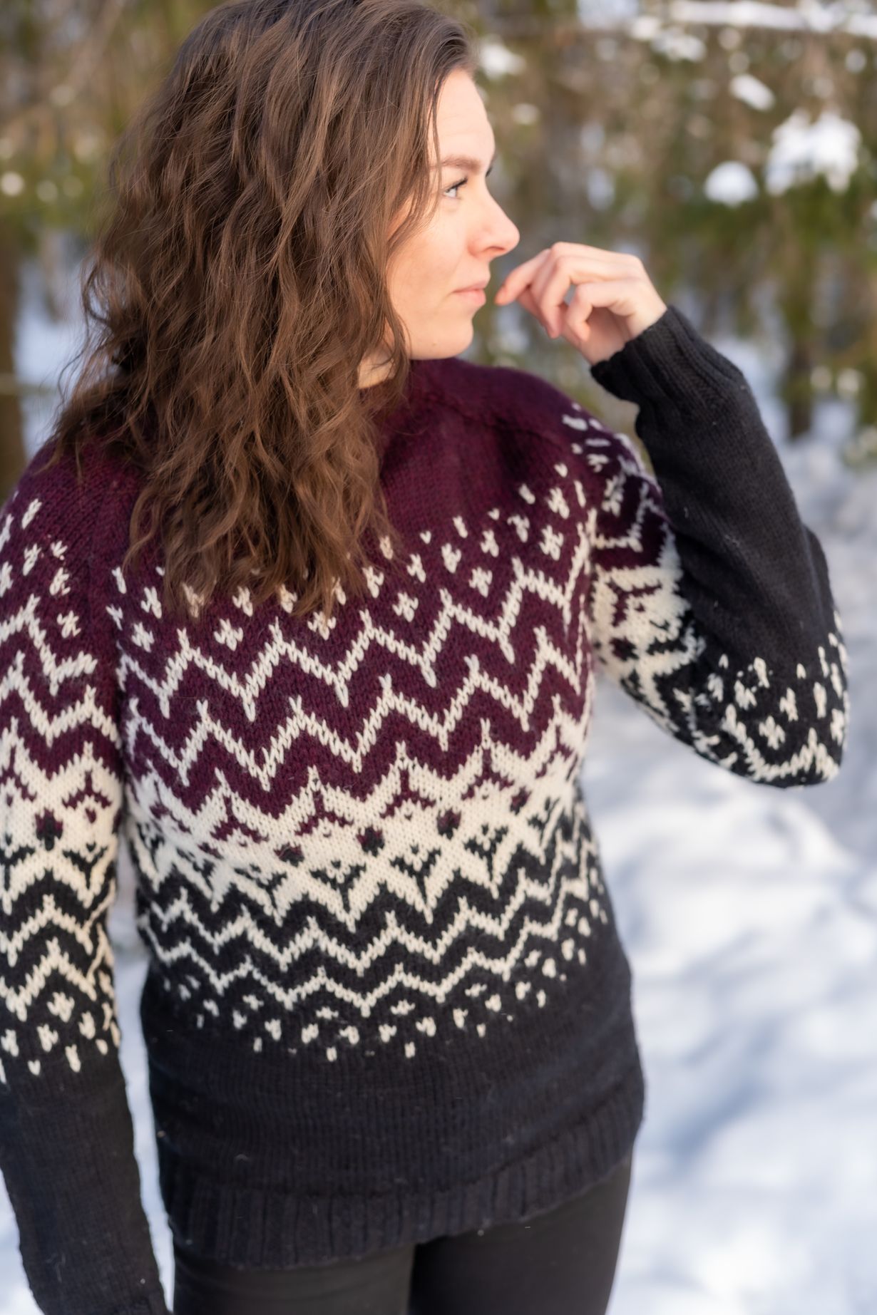 Ensimmäinen aikuisiällä tehty villapaitani. Liukuvärjäys-ajatuksella toteutettu kuvioneule, jonka kuviot on itse piirretty. Paidan mallina lankavahvuudelta sopiva raglan-paidan ohje muokkauksin. Langat Lima (violetti ja musta) ja Wiking garn (l. valkoinen).