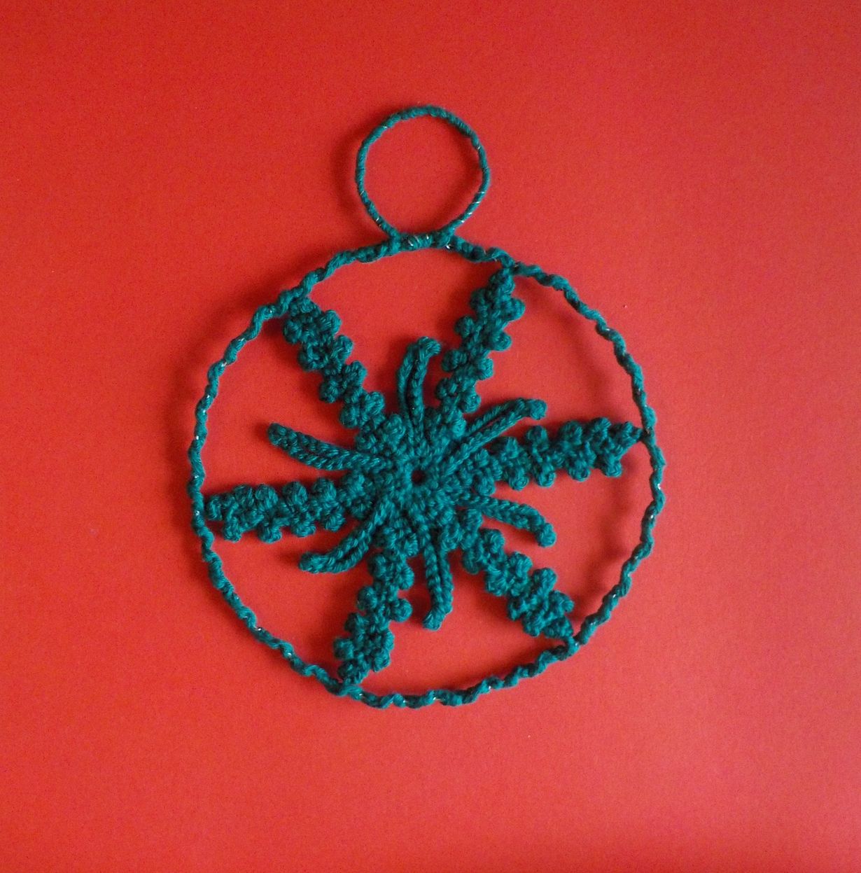 Itsetehty virkattu lumihiutale, johon tehty metallilangasta kehys