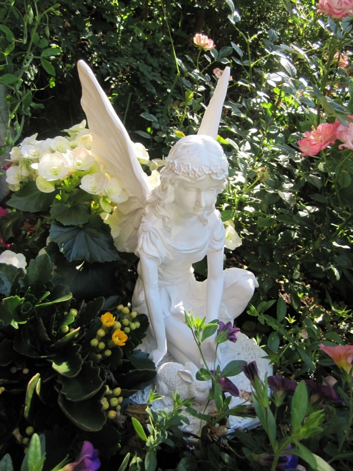 Tämä ei ole hauskin puutarhakoristeeni, koska sen tarina ei ole hauska. Kaunein se on. Viime kesänä pihapiirissämme asusteli hellyttävä pieni jäniksenpoikanen. Eräänä päivänä paikalle sattui iso kulkukissa ja tappoi sen. Seuraavana päivänä löysin tavaratalosta puutarhakoristeen, jossa keiju hoivaa pikkuista pupua. Myöhemmin pihapiiriin tuli uusi jäniksenpoika eikä kissaa enää näkynyt.