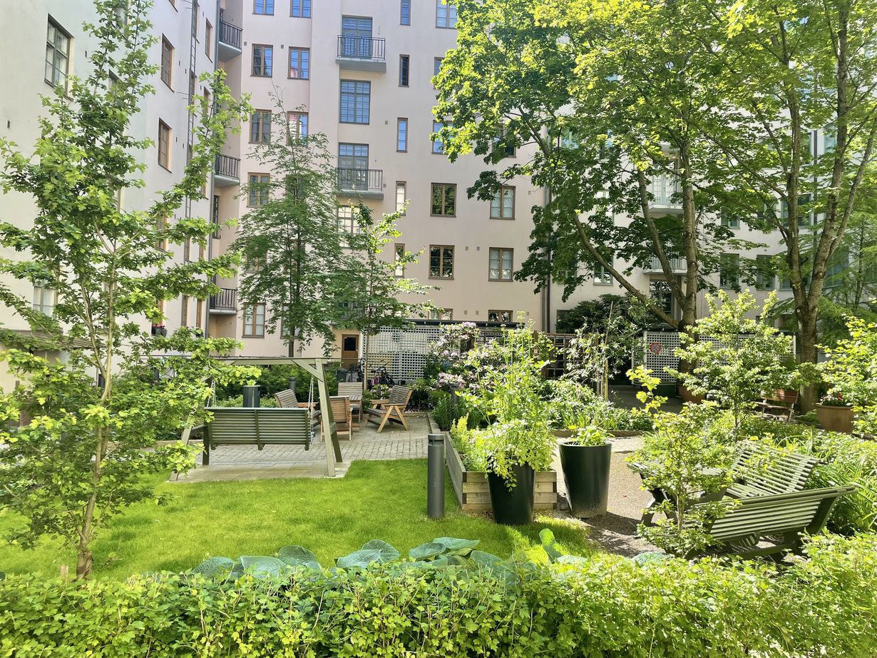 Töölöläisen sisäpihamme oli ennen vallanneet autot, kunnes porukalla päätimme, että parkkipaikkojen sijaan pihalle tehdään vihreä keidas. Sisäpihalla on nyt kaksi ruokailuryhmää ja keskiössä keinu. Istutuslaatikot, pensaat ja kukkapenkit ihastuttavat keinussa istujia. Kaikista ihaninta on kuitenkin ollut jutella naapureiden kanssa ja tutustua kaiken ikäisiin kanssa-asujiin. Onpa pihassa keinun vieressä pidetty myös synttärijuhlat ja nimetty vauvakin!