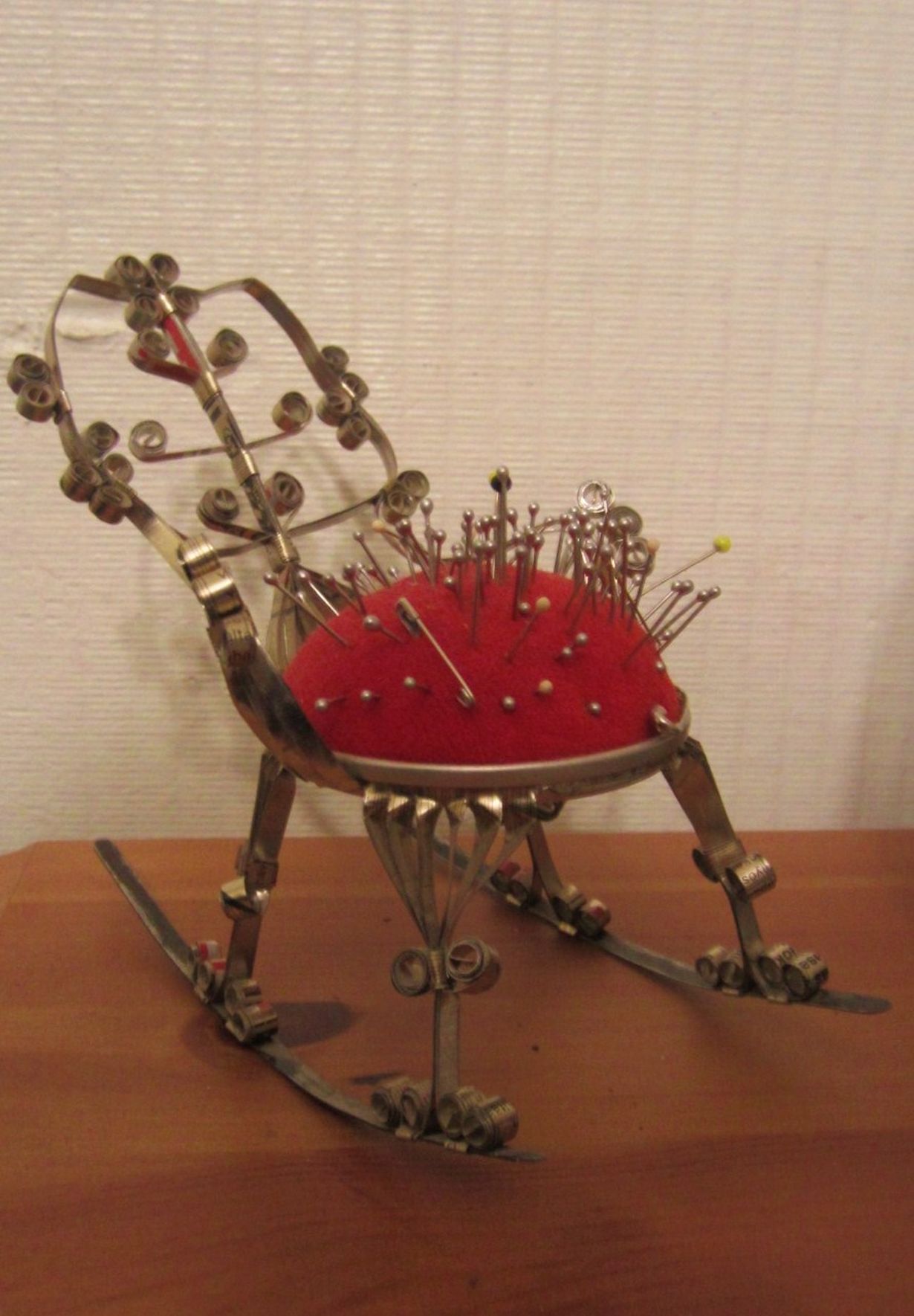 Vuosien takaa joku näppärä askarrellut keinuvan neulatyynyn.