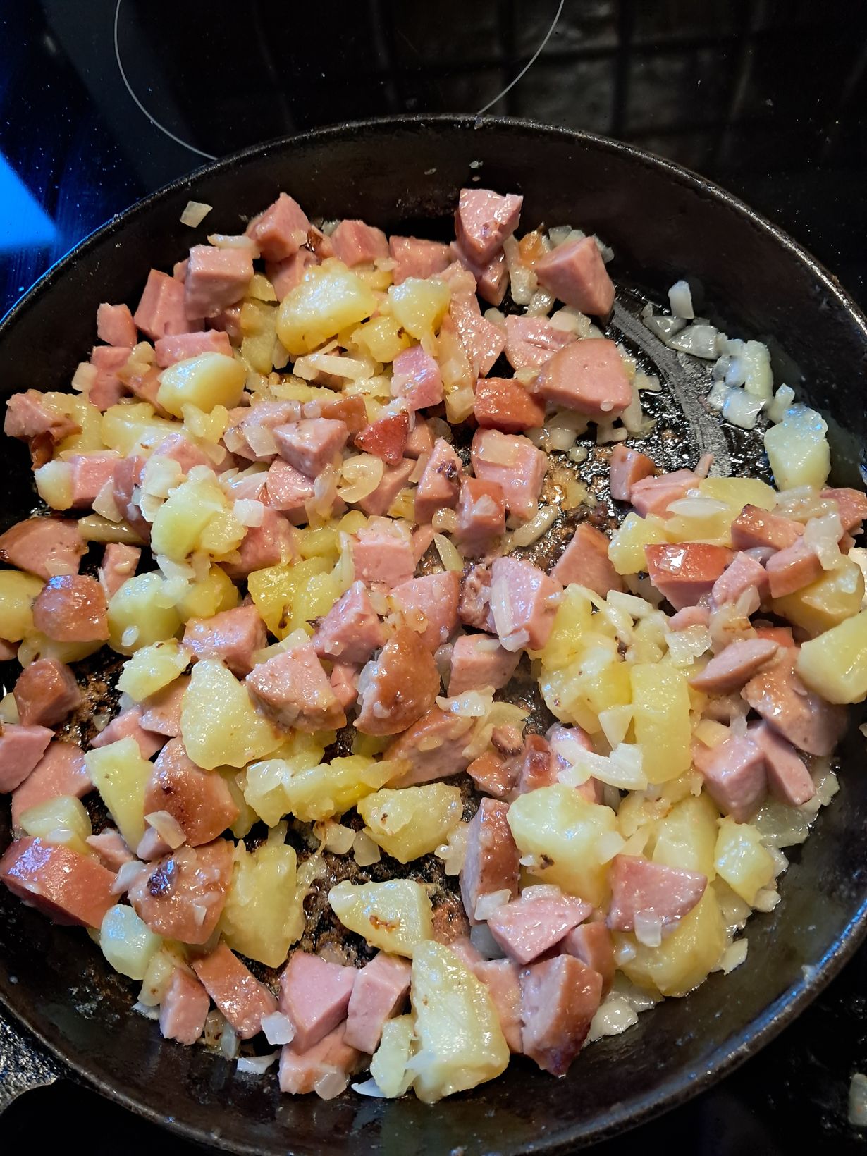 Lähetä kuvakisaan kuva ruuasta, joka onnistuu aina - voita Lapuan Kankureiden villahuopa Keitettyä perunaa, lenkkimakkaraa ja sipulia paistettuna. Mummeli 27.5.2025 klo 15:36 Ns pyttipannua ilman paistettua munaa.