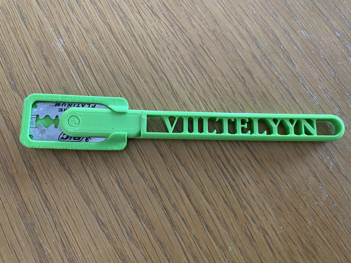 Partakoneen terä muovisessa varressa, omalla tekstillä. Joka toinen päivä viileän tällä hapanjuurileipiini syvät viillot ennen uuniin laittoa.