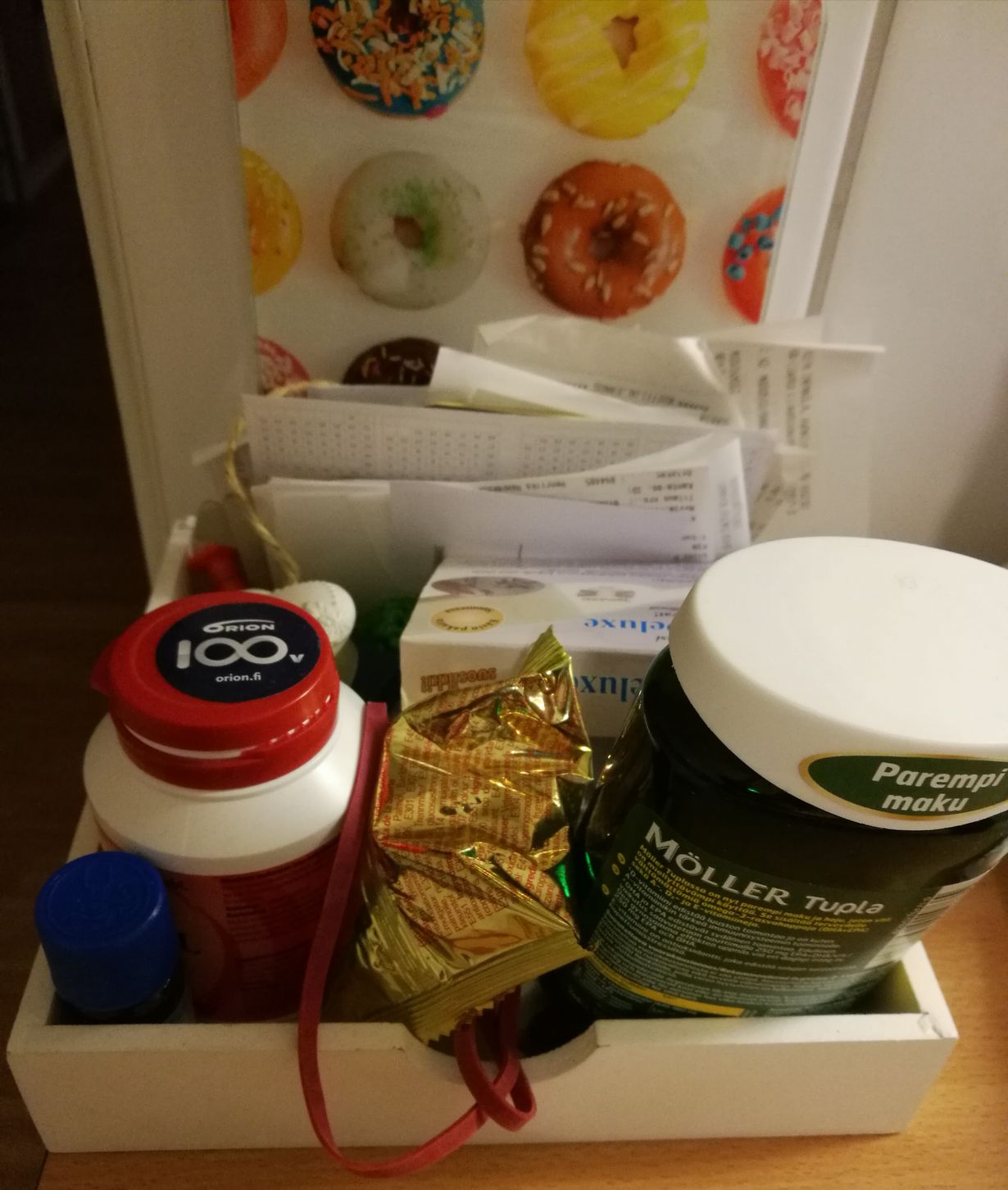 Anopilta lahjaksi saatu sydänleikkauksin koristettu ihan nätti serviettiteline on päätynyt palvelemaan sekalaisen sälän laskualustana, koska arjessa serviettejä käytetään meillä harvoin. Sisältö tulee tarkistettua ja järjestettyä pari kertaa vuodessa.
