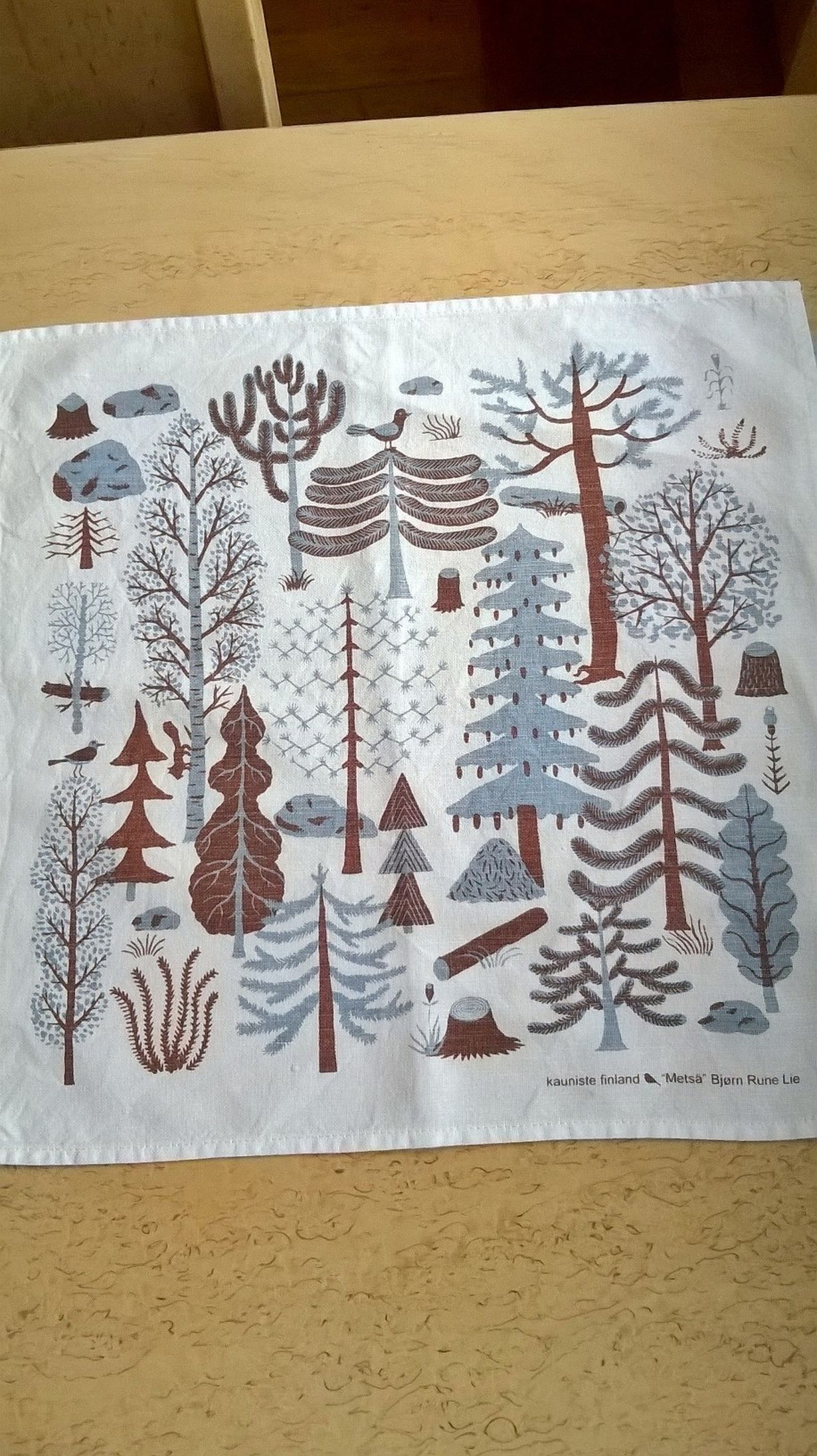 Pyyhkeeni on pellavaa ja kotimainen. Siinä on myös lempiaiheeni kuvattuna, luonto ja metsä. Hankin varmaan toisenkin samantyylisen ja teen siitä uutena taulun keittiön seinälle.