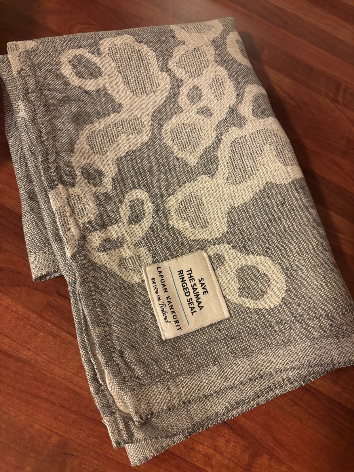 Tämän ihanan pellavaisen pyyhkeen ostin oopperamatkalta Savonlinnasta kesällä 2025. Se muistuttaa kivasta reissusta ja ostamalla tein myös hyvää, sillä osa tuotosta ohjautuu Saimaannorpan suojeluun.