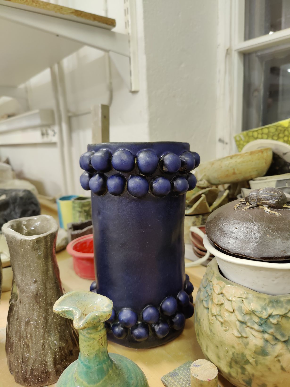 Violetti puolipallokoristeltu maljakko valmistui viime syksynä keramiikkakurssilta. Paluu rakkaan harrastuksen pariin on ollut palkitsevaa! Kevätkaudella aion tehdä maljakkoon sopivan astiasarjan.