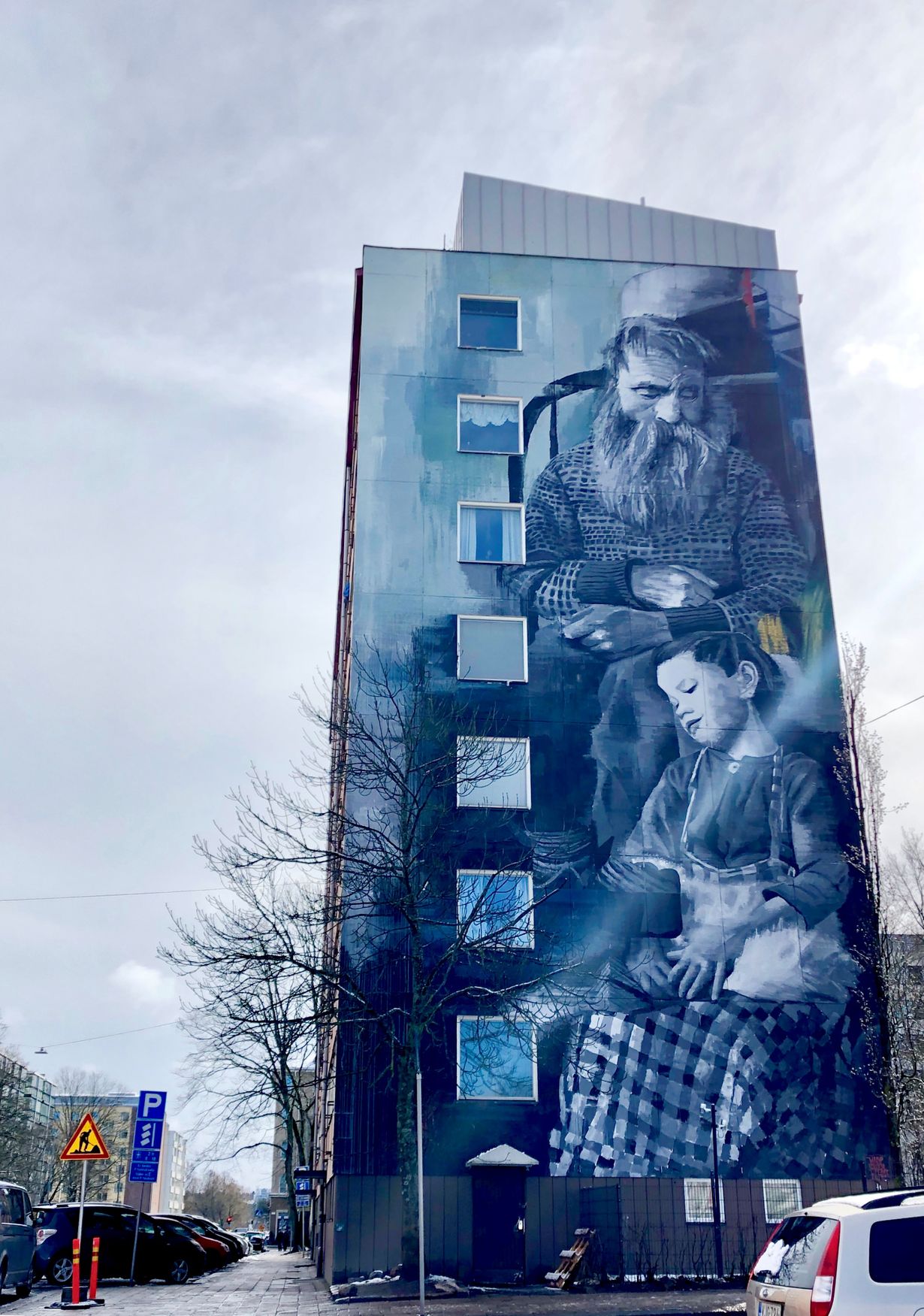 Tämä upea, taidokas muraali löytyy Turusta Kerttulinkadulta. Sen on maalannut britti Wasp Elder, joka on kuulema saanut inspiraation tähän vanhasta suomalaisesta valokuvasta. Hahmot ovat jotenkin niin herkkiä ja aitoja, että niitä tekee mielii ihailla pitkään ja jopa silittää vanhan ukon rypistynyttä poskeaa ja halata pikkuista tyttöä.