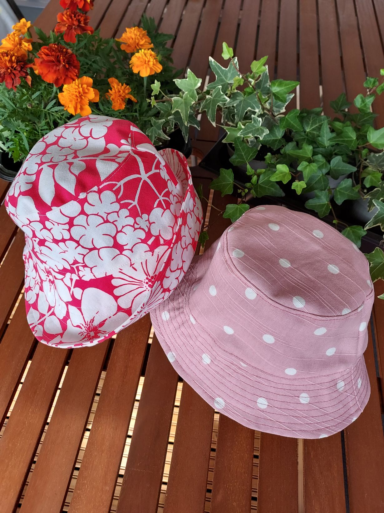 Valkokukkainen,äitini mekkokankaasta leikattu hattu, on odottanut ompelua pari kymmentä vuotta. Nyt se tuli valmiiksi uuden kesähatun myötä.