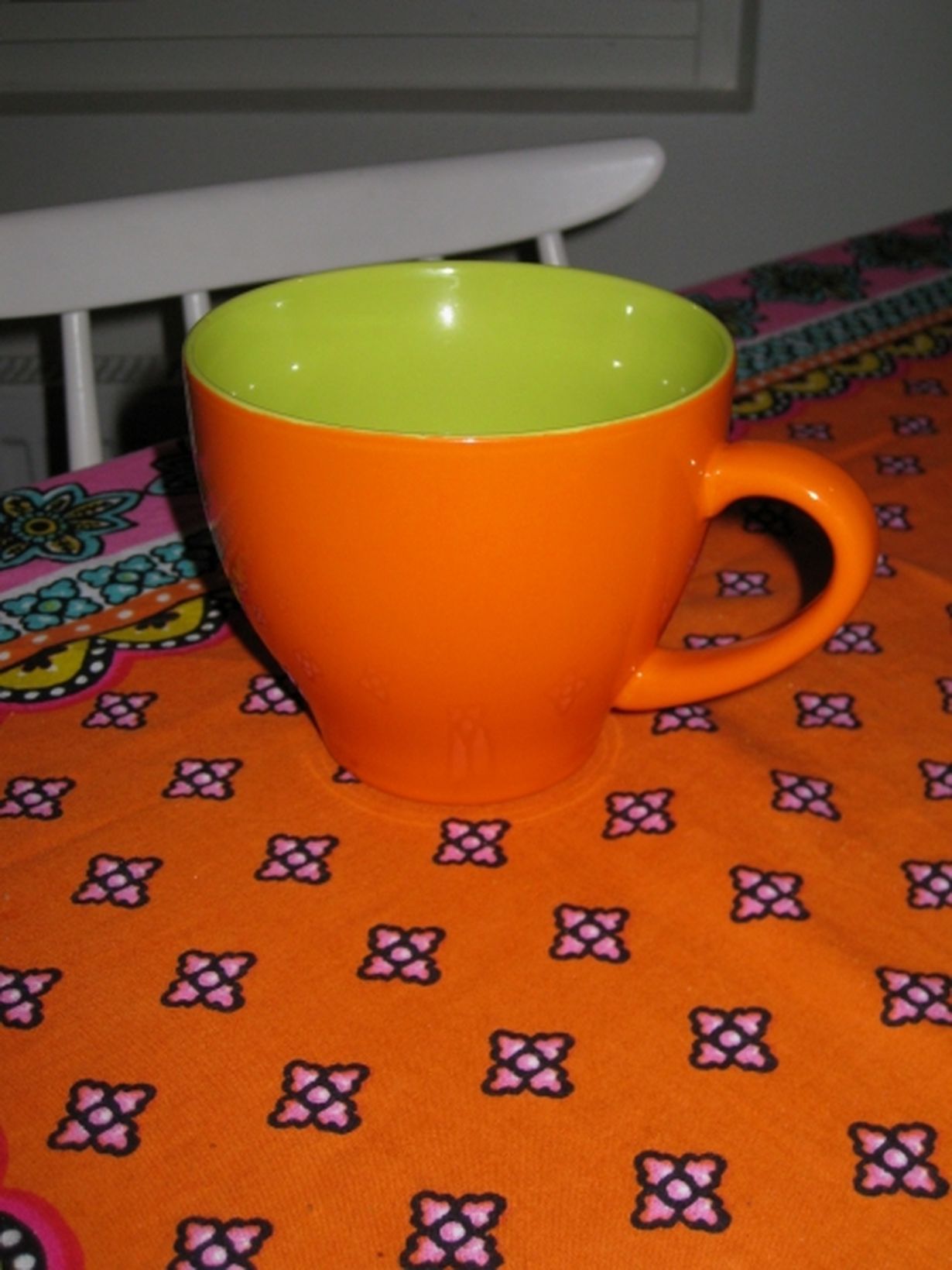 Olen ostanut kahvikuppini jo teini-ikäisenä Indiskasta. Pidän kahvikupistani paljon, sillä se on iso ja kesäisen värikäs. Sen pirteys tarttuu aamulla minuunkin ja mikä parasta, se sopii myös muuhun värikkääseen sisustukseen kotonani.