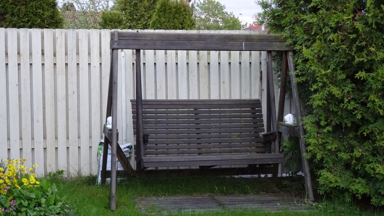 Tässä tulee keinuteltua kesäisin, kun käyn kyläilemässä. Iso tuija keinun vieressä antaa kivasti varjoisuutta hellepäivänä.