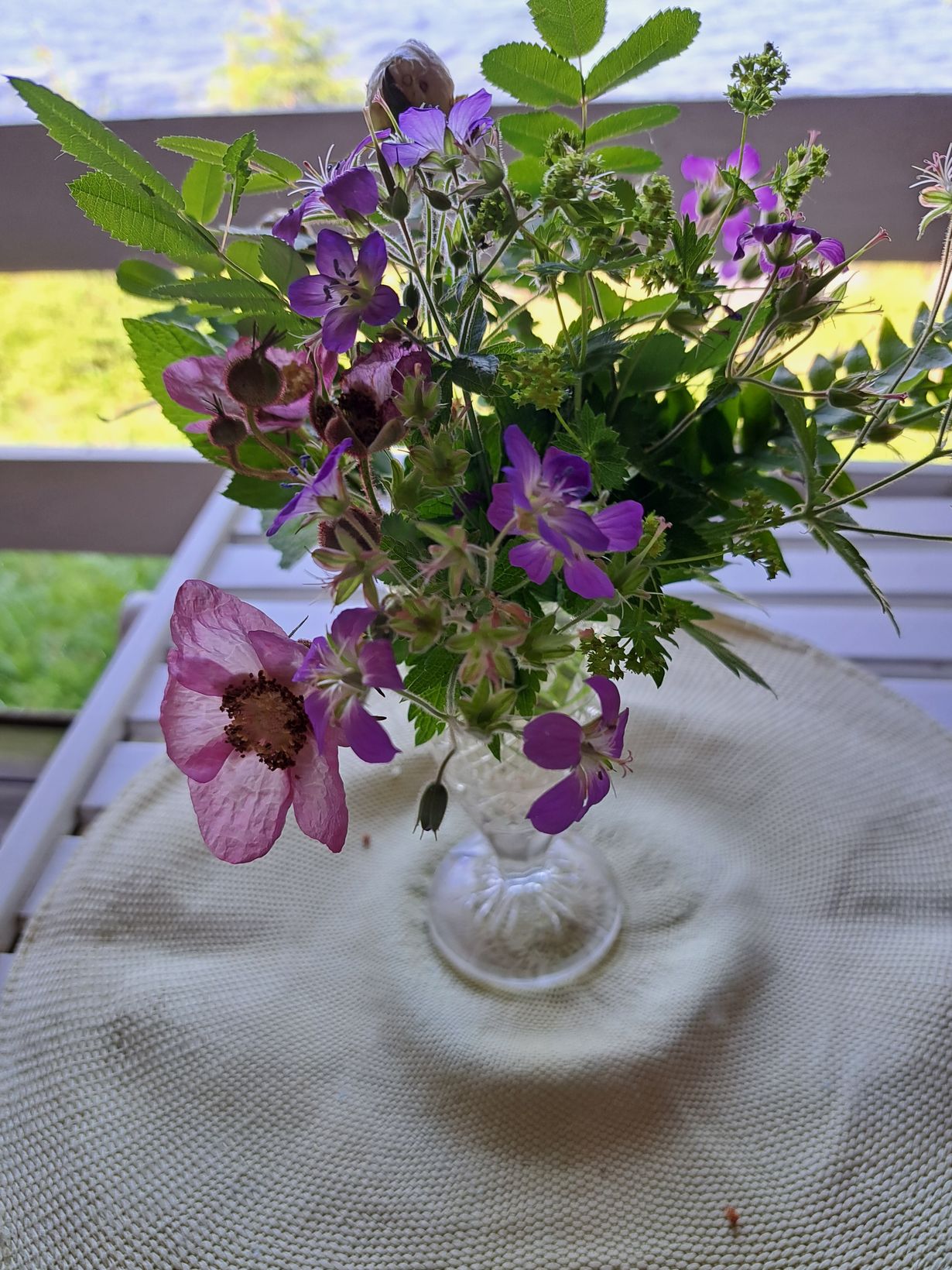 Keään aina kukkia ollessamme mökillä. Kukat ovat kuistin pöydällä ilonamme, harvoin vien sisälle. Istumme paljon kuistilla, koska sieltä avautuu järvinäkymä ja auringonlasku.
