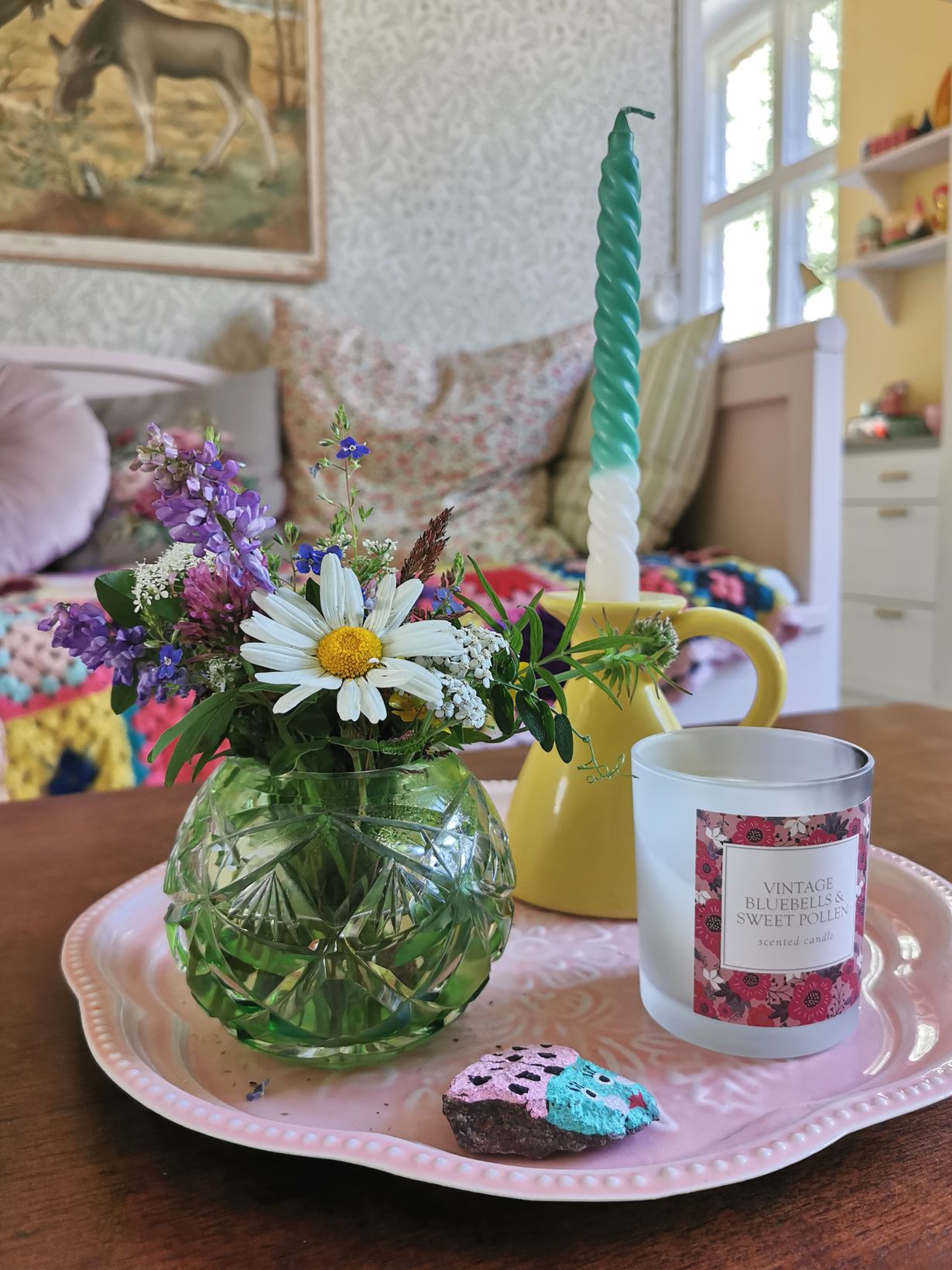 3-vuotias tyttäreni kävi äitini kanssa kävelyllä ja tuliaisiksi sain soman pikku kimpun, joka sopi täydellisesti mummulasta perimääni maljakkoon.