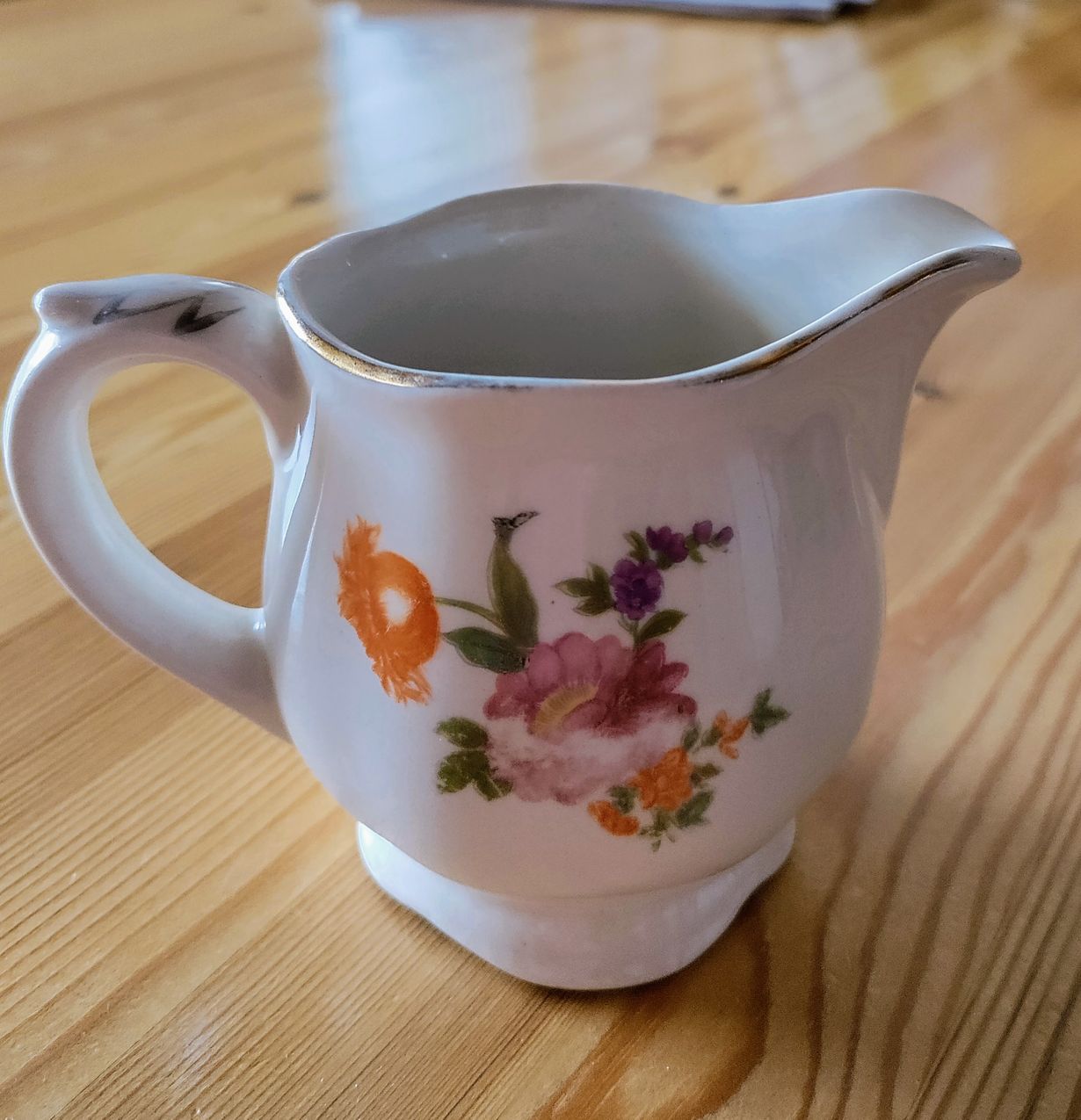 Tämä arabian Kesäkukka-sarjan kermakko on 30-luvulta. Kermakkoa on käytetty aikoinaan paljon ja reunakultaus ja kukkakuviointi ovat vähän haalistuneet. Kannu on minulle arvokas muistoesine menneiltä sukupolvilta.
