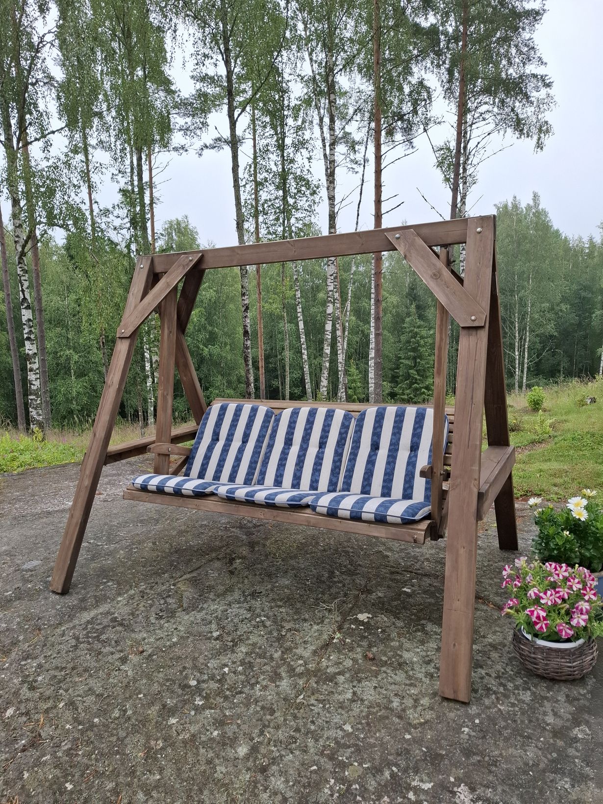 Tämä keinu oli ensimmäinen hankintamme mökin pihaan. Siinä on ihana levähtää, kuunnella lintujen visertelyä ja iltaisin katsella auringon laskua.