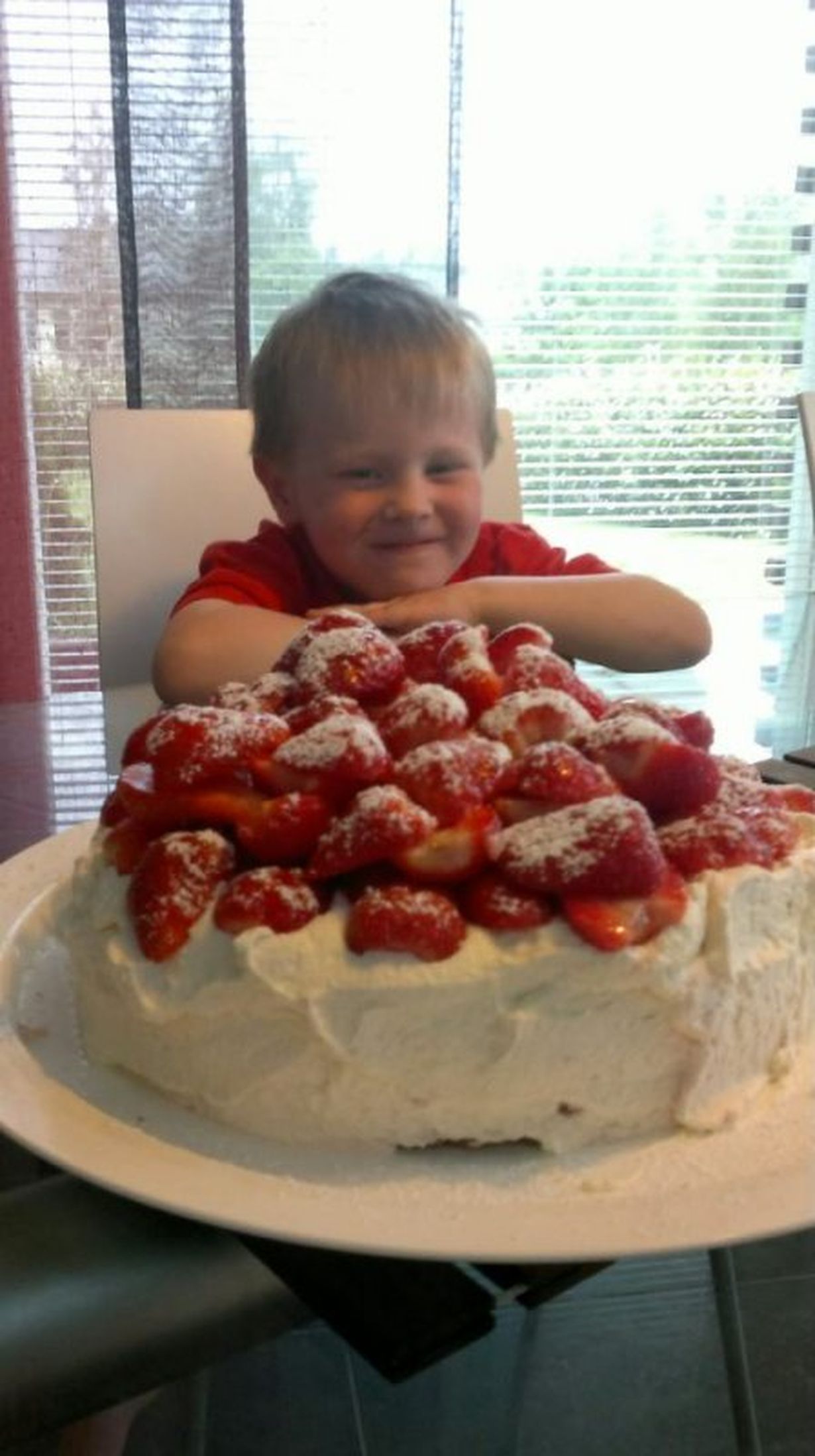 Mummu sai tämä kuvan puhelimeensa tekstillä " Maistuis varmaan sullekin". Kuvassa pojanpoika Roni muikistelee valtavan, herkullisen näköisen mansikkakakun takana...odotellen hetkeä, että saapi ottaa ison palan ja alkaa herkutella. Mummu vähän arveli, että perässä tulee kuva, jossa pojalla on suupielet kermavaahdossa :) Kakku oli kesän ensimmäinen ja tehty ihan vaan arkipäivän piristykseksi. Kuvan on ottanut äiti-Johanna.