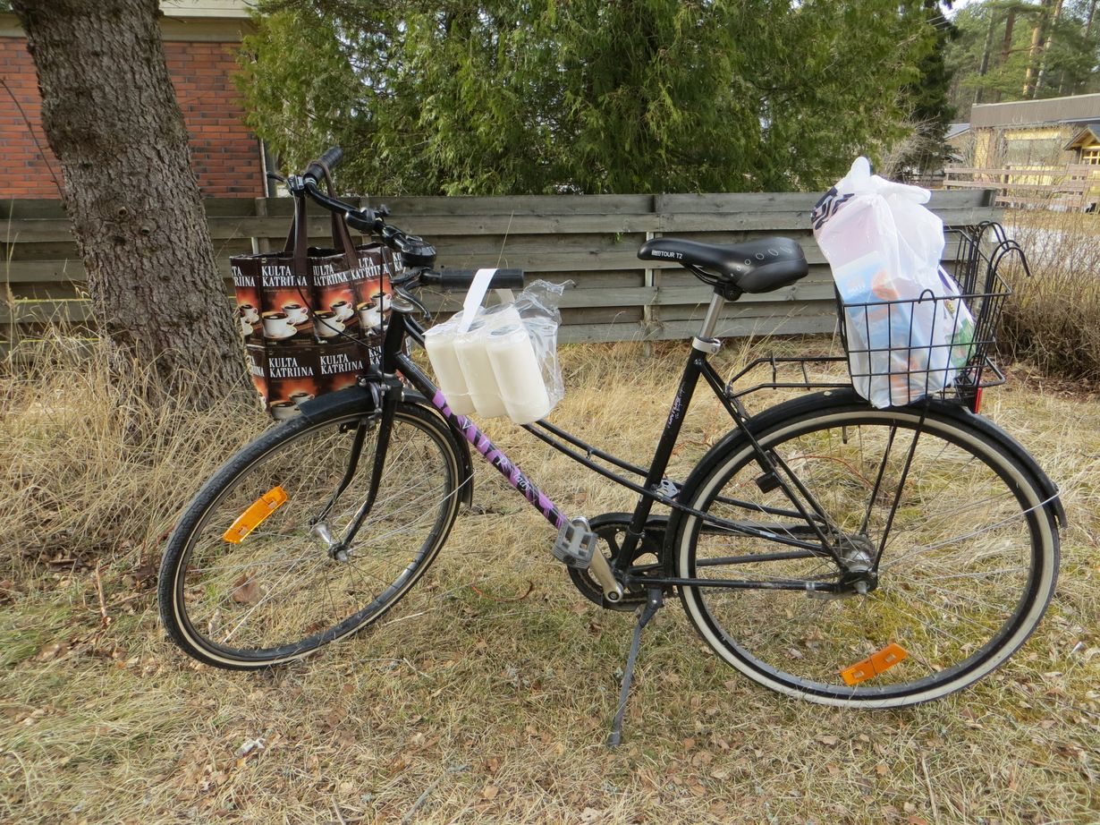 Otsikko on harhaanjohtava, sillä liikun polkupyörälläni kesät talvet! Kuvan musta Tunturi on palvellut minua kohta 22 vuotta, enkä toivo sen hylkäävän minua koskaan. Pyöräni on kätevä käydessäni ostoksilla parin kilometrin päässä. Tällaiselta reissulta olen nytkin palannut kotipihaan. Hautakynttilöistä yksi on matkan varrella kadonnut pakkauksesta: sytytin sen isäni ja isäpuoleni haudalle. He molemmat olivat sotaveteraaneja, ja huomenna vietetään Veteraanipäivää!