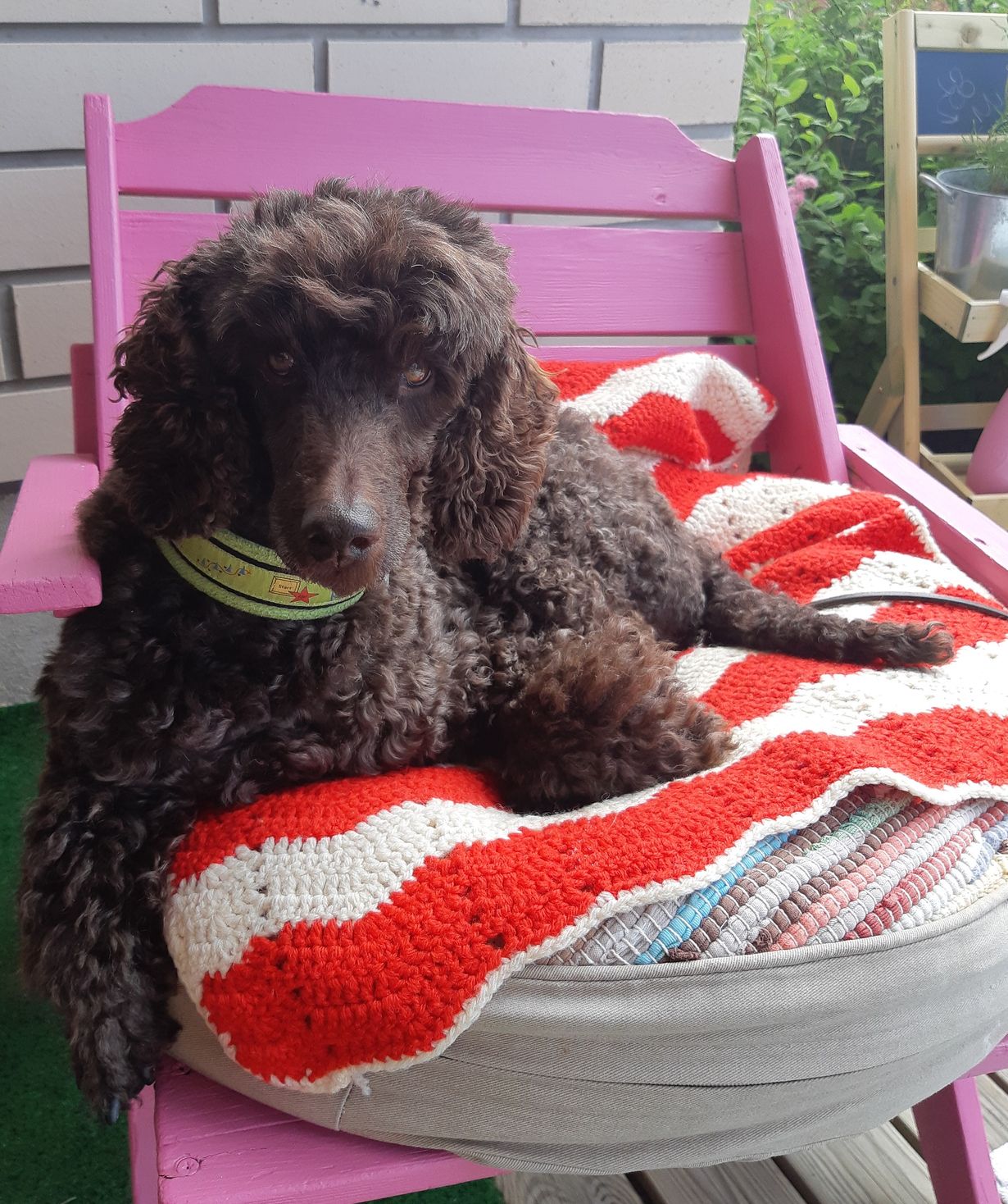 Kuka sitä nyt makaisi kovalla tuolilla, kun voi kesää viettää tyynylläkin?! Dannyn kesäpeti on huokuu muistoja, sillä tuoli on vanhempieni tuoli 80-luvulta, tuoli on tosin maalattu uuteen uskoon. Tyynynä kotimaista tuotantoa, peittona minun vauvapeittoni 70-luvulta! Mikäs tässä köllötellessä, tuumii Danny <3