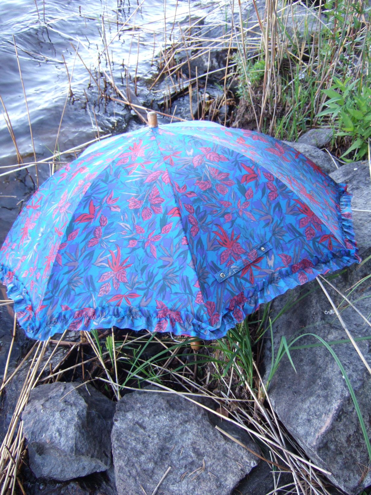Tämä jo reunoistaan rispaantunut sateenvarjo on kulkenut matkassani noin kymmenen vuotta. Ostin tämän aikoinaan värin ja kuosin perusteella.