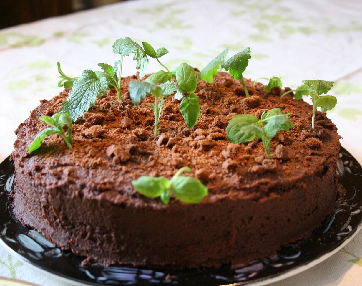 Mehevän multainen ja pieniä taimia kasvava kakku oli juuri sopiva minun synttäreilleni. Oikeastihan se oli vain suklaakakku mintunlehdillä koristeltuna.