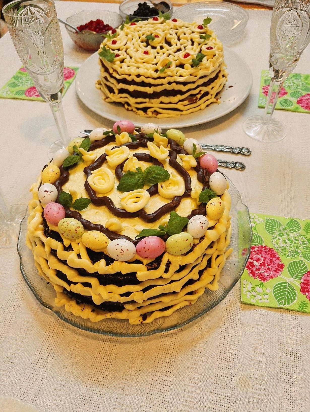 Kakkujen valmistukseen meni 2 päivää: edeltävänä päivänä pohjien ja täytteiden tekoa, yön yli jääkaappiin imeltymään, ja juhlapäivänä taideteosten viimeistelyä koristeilla. Toisen kakun makuna kahvisuklaa ja toisen vaniljainen mustaherukka.