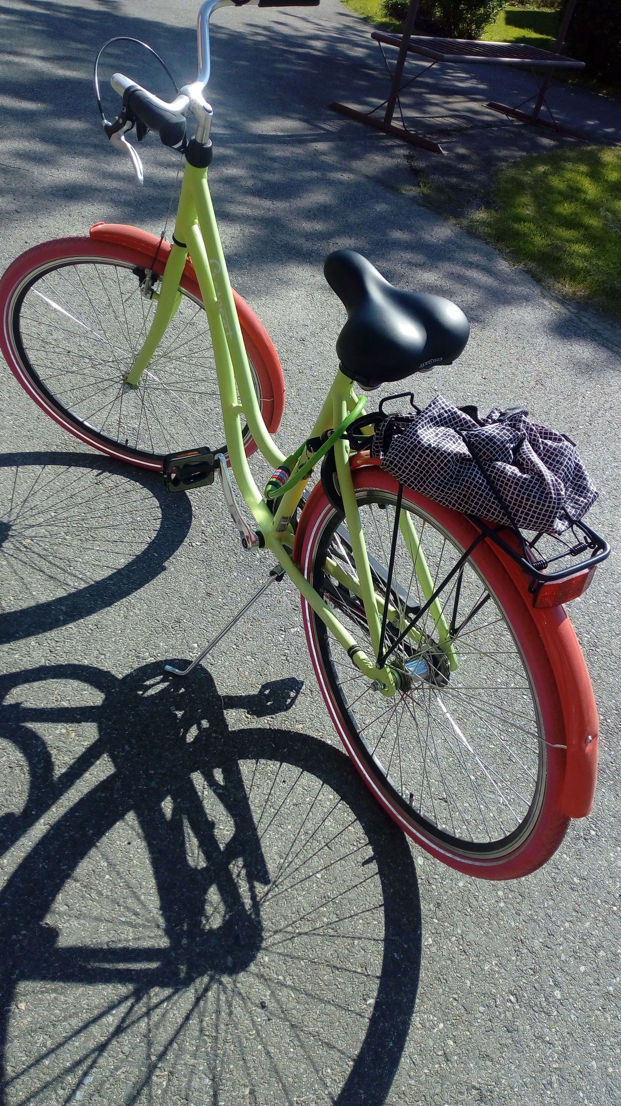 Vaaleanpunaiset renkaat, punaiset lokasuojat ja lempivärini kevään vihreä pyörän runko!