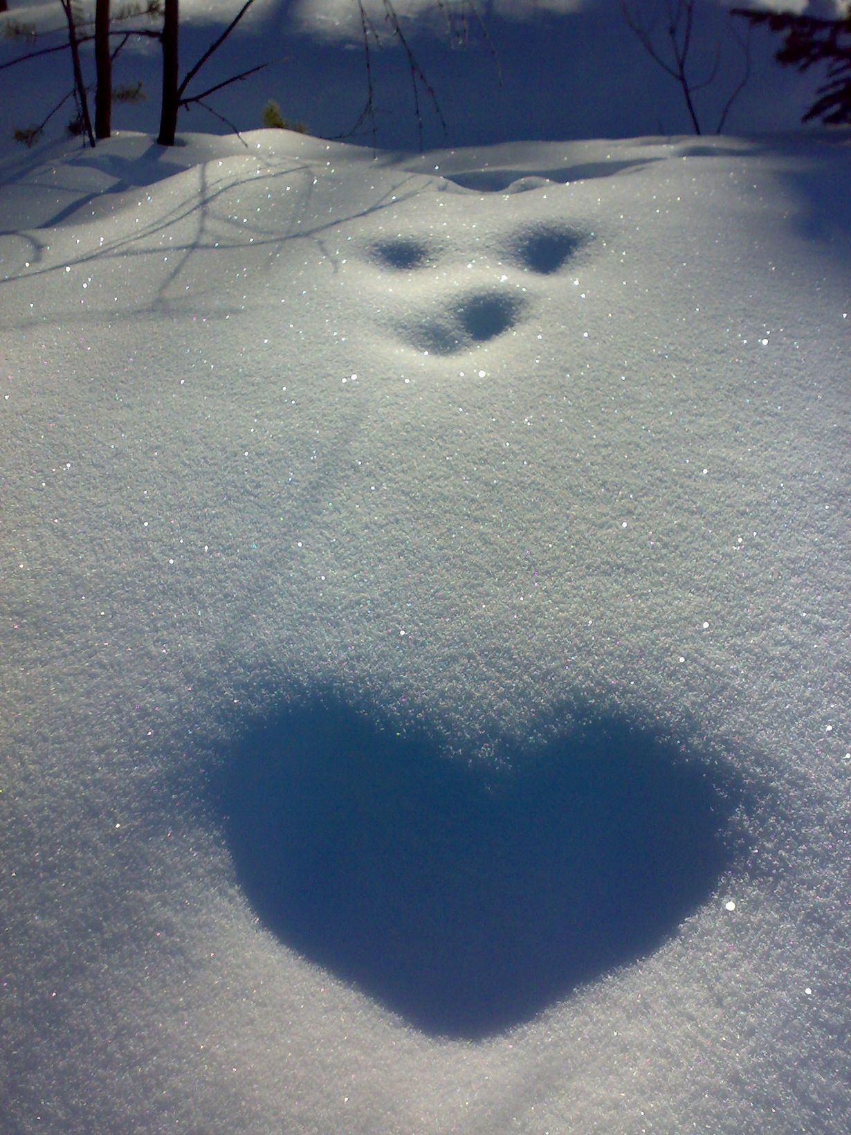 Jänis oli hypännyt polulta hankeen ja auringonsäteet olivat sulattaneet etu- ja takajalkojen jäljet yhteen.