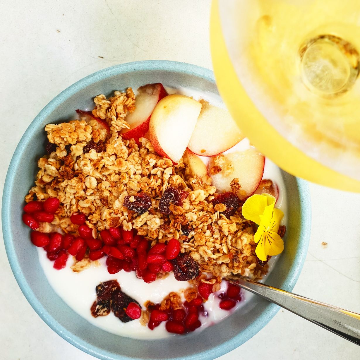Pohjalla jogurttikulhossa on hilloa ja päällä granolaa ja granaattiomenan siemeniä. Kyytipojaksi oman puutarhan omenoista omenamehua ♡