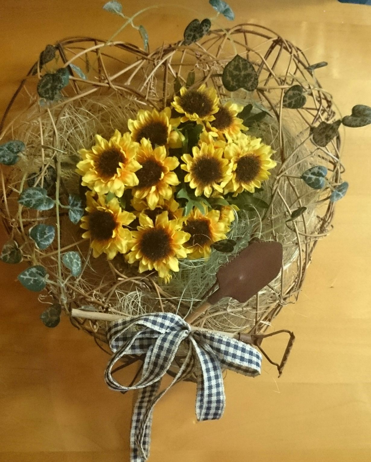 Kukkakimpussa tulleesta kehikosta, kynttilämanseteista ja köynnöksistä väketretty ovikoriste. Pikkulinnut ovat kovin kiinnostuneita kukkien keskustoista, vaikka eivät olekaan aitoa tavaraa. :)