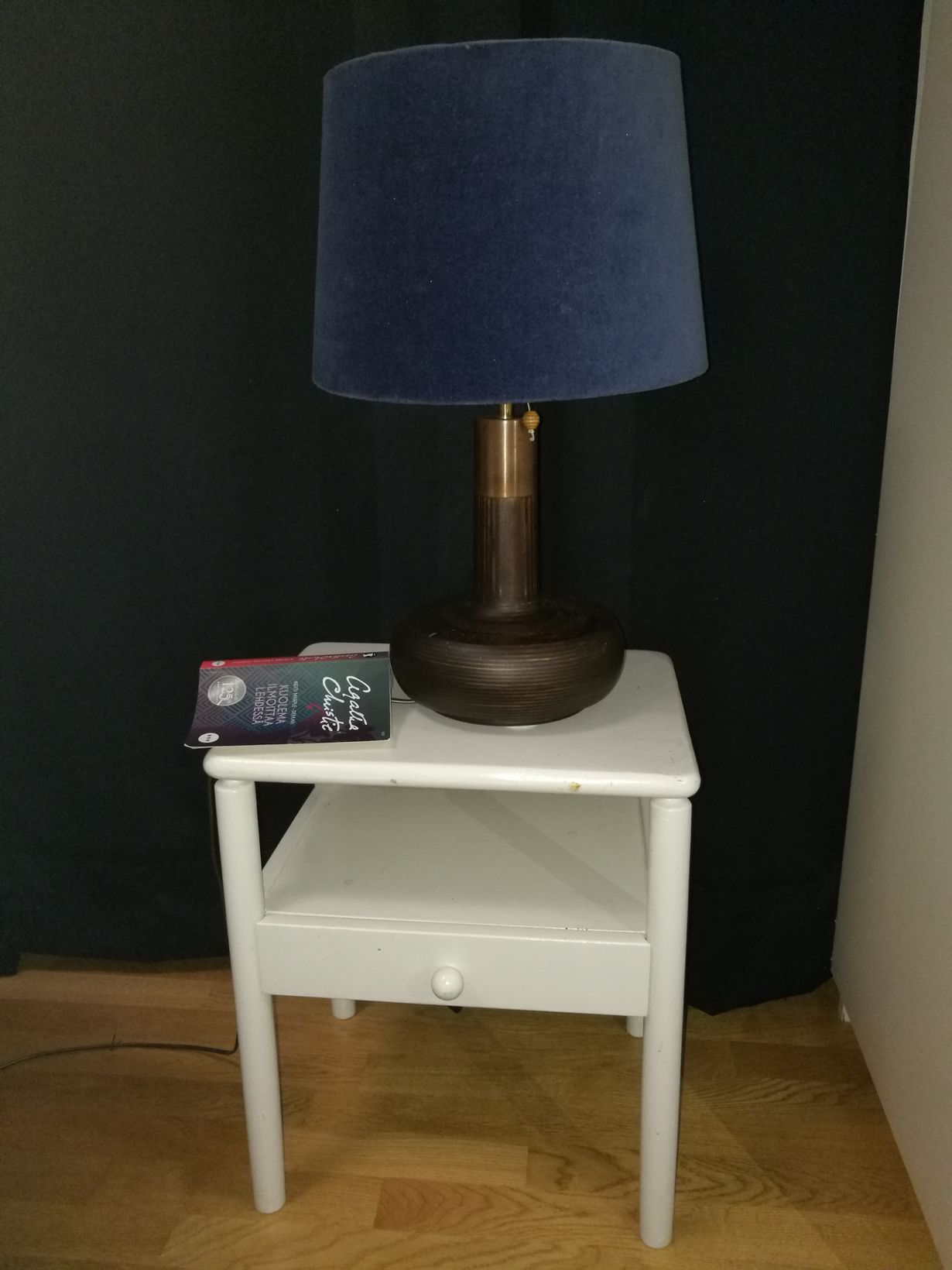 Tämä pikkupöytä on löytynyt joskus Kotkasta kierrätyskeskuksesta. Isäni taisi sen maalata, kun oli piirrustuksia täynnä. Jotenkin tykkään tästä pienestä ja vaatimattomasta yöpöydästä. Se saa kantaa itse restauroimani lampun.