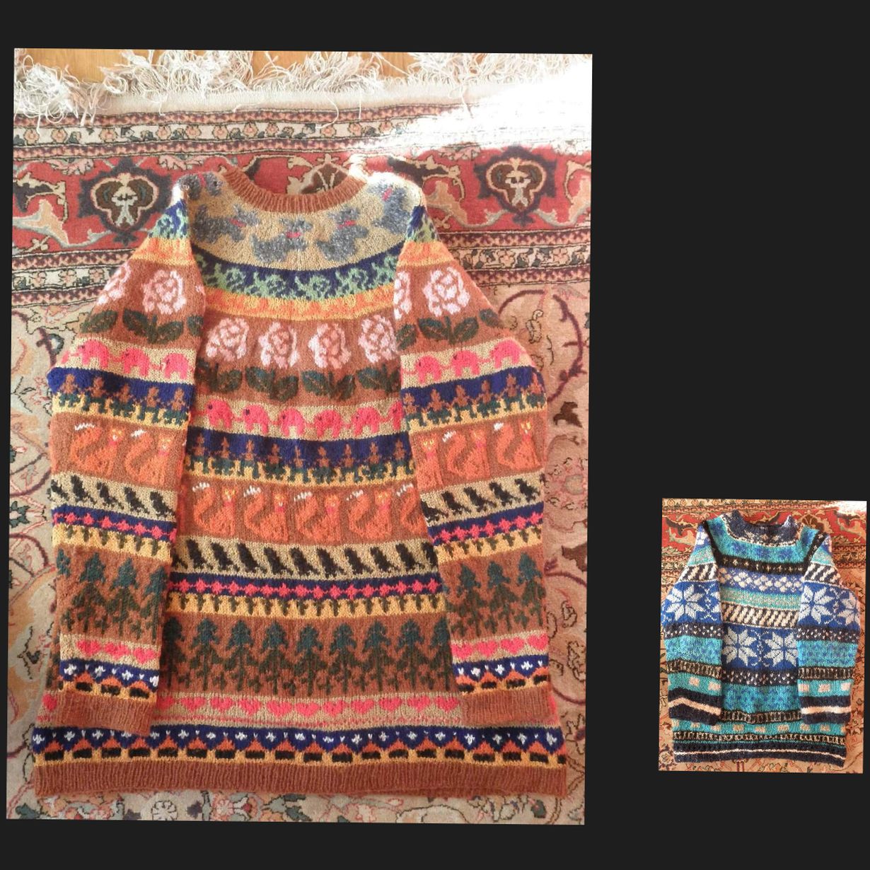 90-luvun alussa purin pääasiassa junamatkoilla70-luvulla kutomani puserot. Mallit suunnittelin ruutupaperilla. Useamman puseron tein. Lisälankoja löytyi lankavarastoistani.