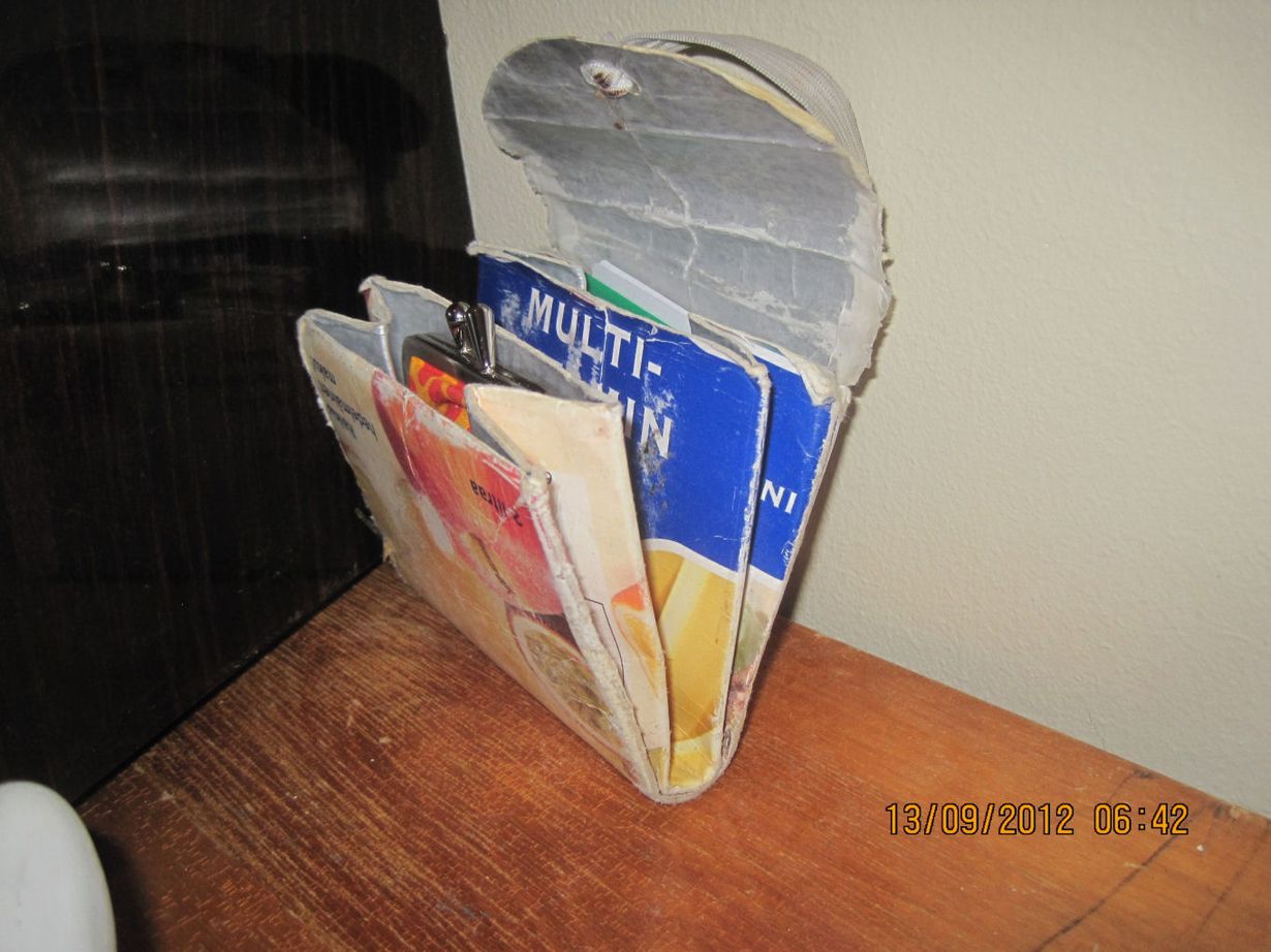 Olin opetusharjoittelussa Afrikassa syksyllä 2011. Siellä ylellisyyttä oli omistaa lompakko ja monet olivat taitelleet sen pahvisesta maito- tai mehutölkistä. Suomessa Afrikassa tekemäni lompakko kävi pieneksi ja tein uuden 2 litran mehutölkistä. Siellä kulkee mukavasti kaikki kortit, setelit ja kolikot omassa lokerossaan. Lompakko on kestänyt kohta vuoden!