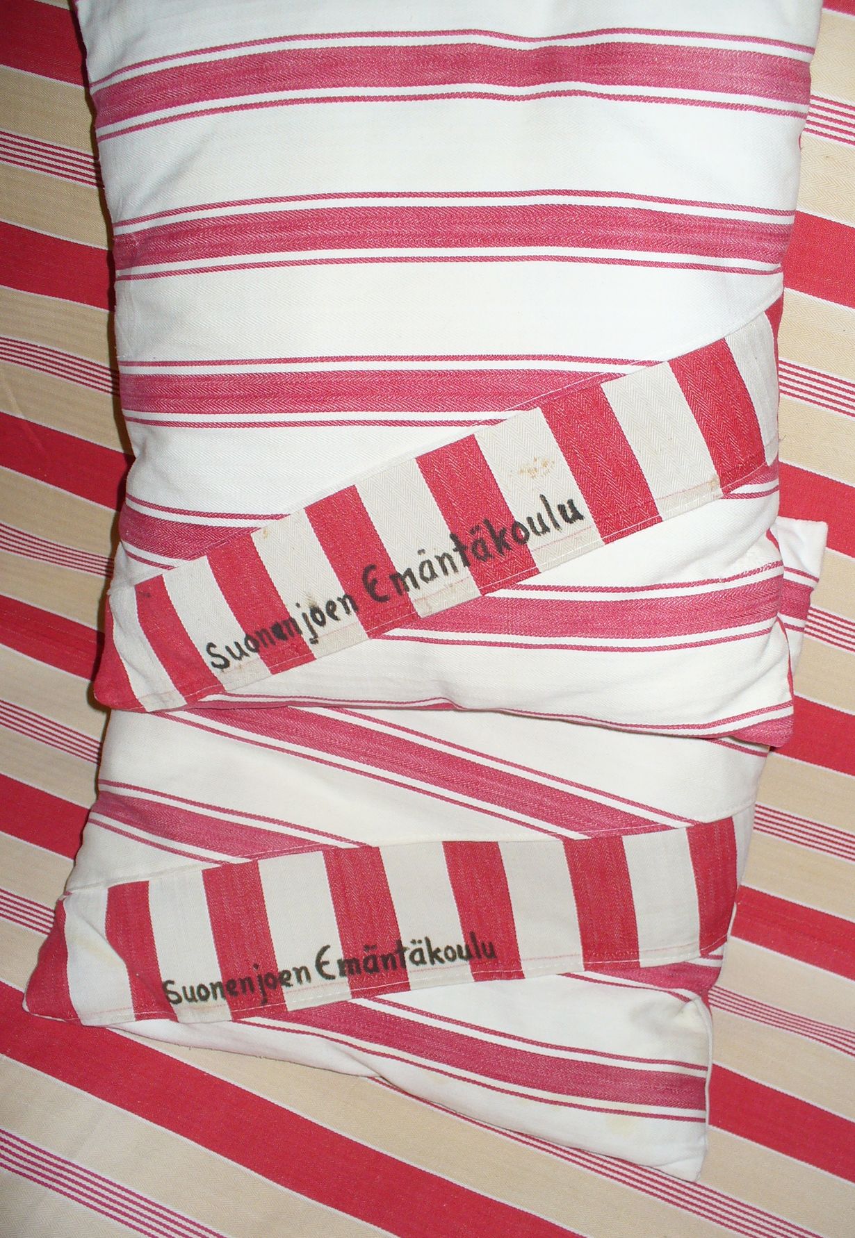 60-luvun opinahjoni vanhoista patjapusseista tehdyt, ne täytettiin aikoinaan oljilla vuosittain. Nyt koulu ei ole enää toiminnassa. Löysin tyynyt ja alla olevan sänkypeiton Lähetysmyyjäisistä Suonenjoelta.
