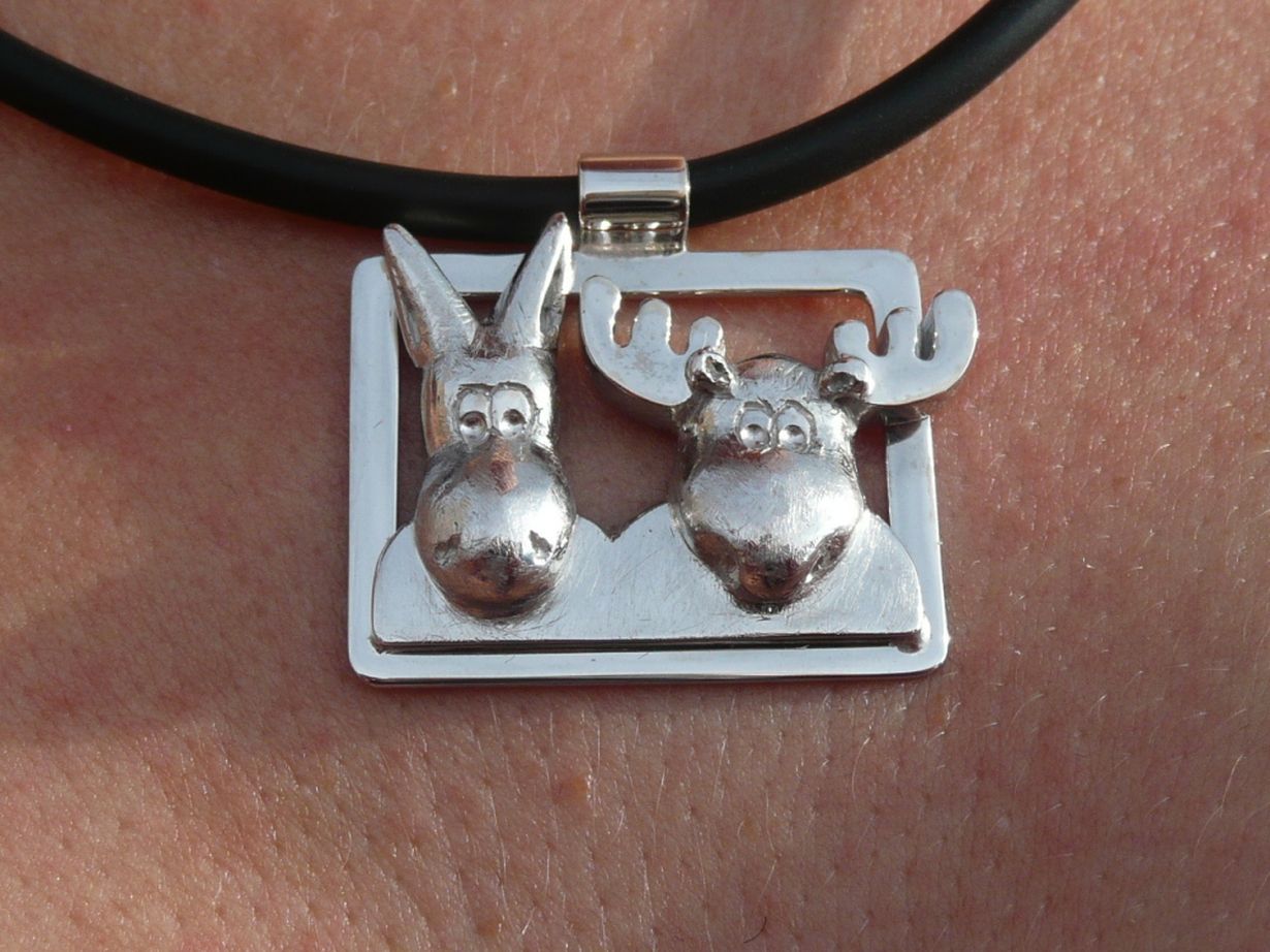 Sain tämän vuosi sitten kihlasormuksen sijaan kihlalahjaksi. Olin viime vuonna raskaana kun mieheni kosi.Mieheni ajatteli että jos sormeni turpoavat raskauden aikana niin en pysty pitämään sormusta.. Hän teetti korun varta vasten valkokullasta. Hänellä on samanlainen. Mieheni lempieläin on hirvi ja minun aasi :-)