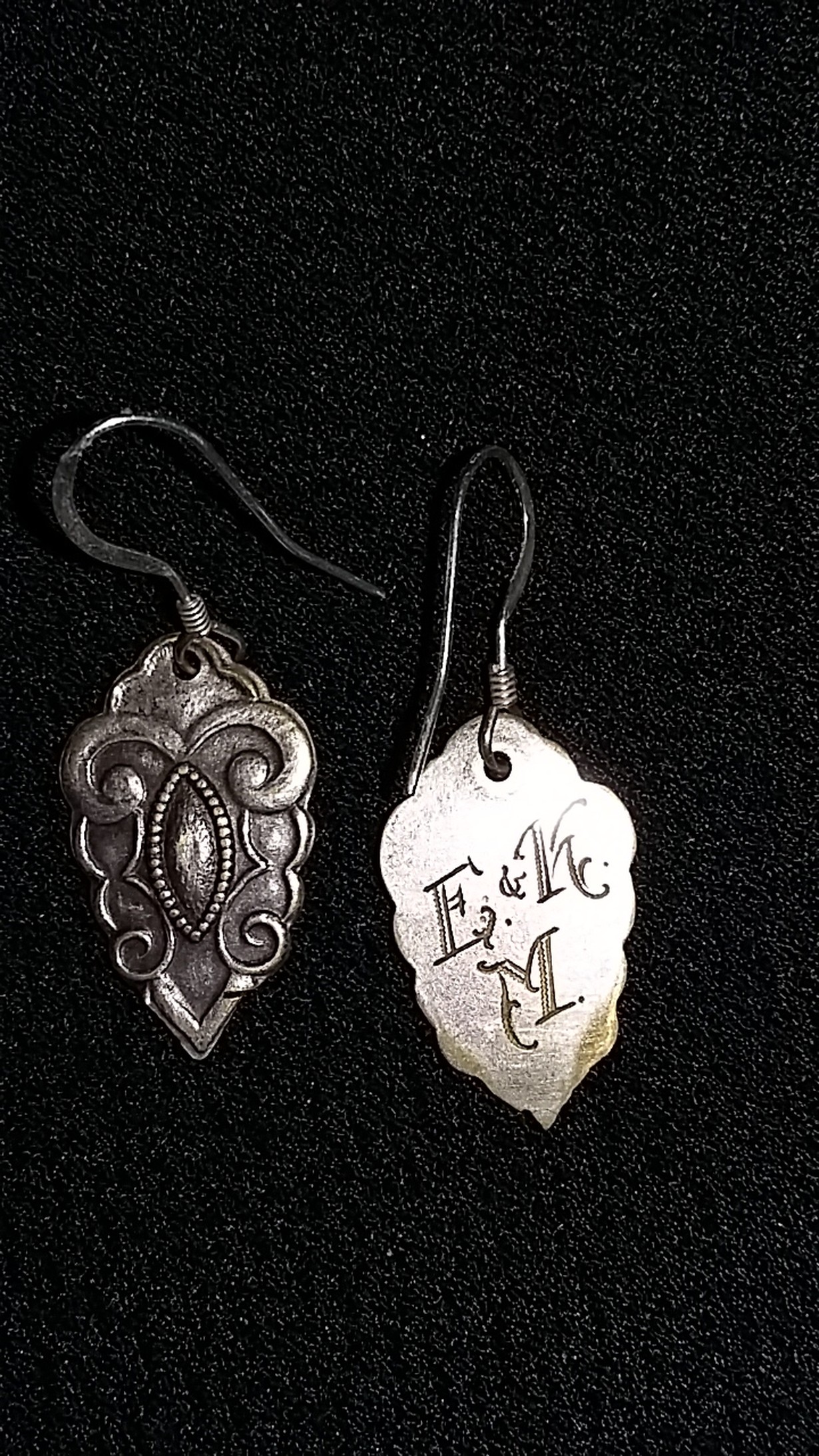 Korvakorut olen itse tehnyt puolison isovanhempien häälahjaksi saaduista kahvilusikoista. Tunnearvoa lisää vielä takana olevat heidän nimikirjaimet.