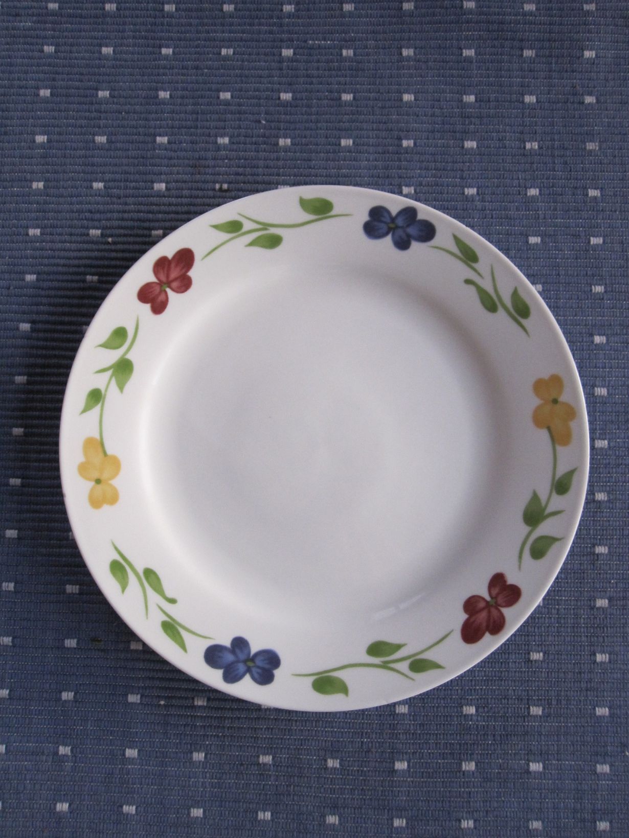 Minulla on kaksi lempilautasta, jotka molemmat ovat kirpparilöytöjä reilun kolmen vuoden takaa ja toimivat leipälautasina mökillä. Tämä kaunis kukkasin koristeltu on made in China.