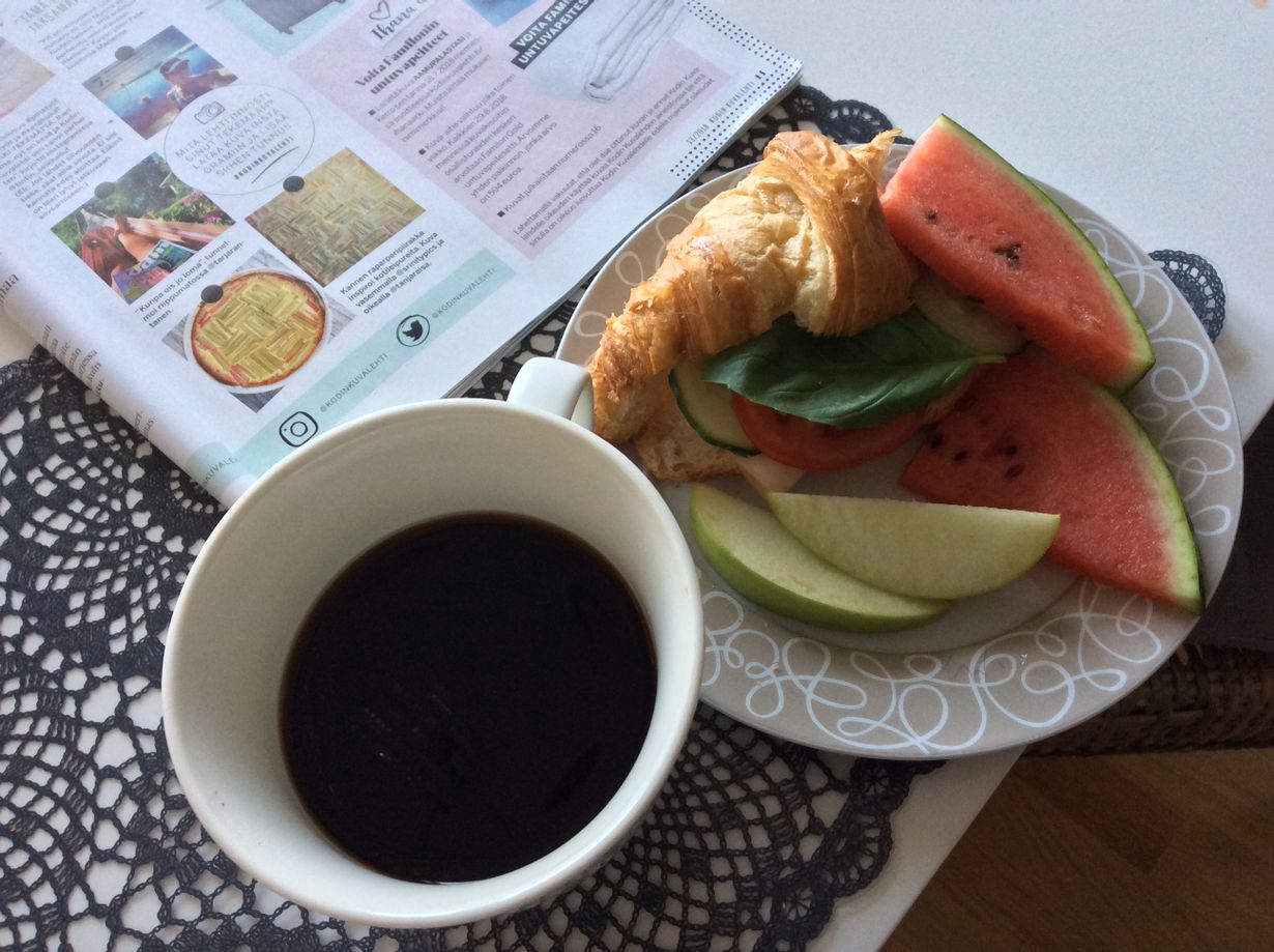 Kardemummakahvia, croisanttia ja hedelmiä. Ihanaa kun lomalla on aikaa enemmän myös aamupalalle ?