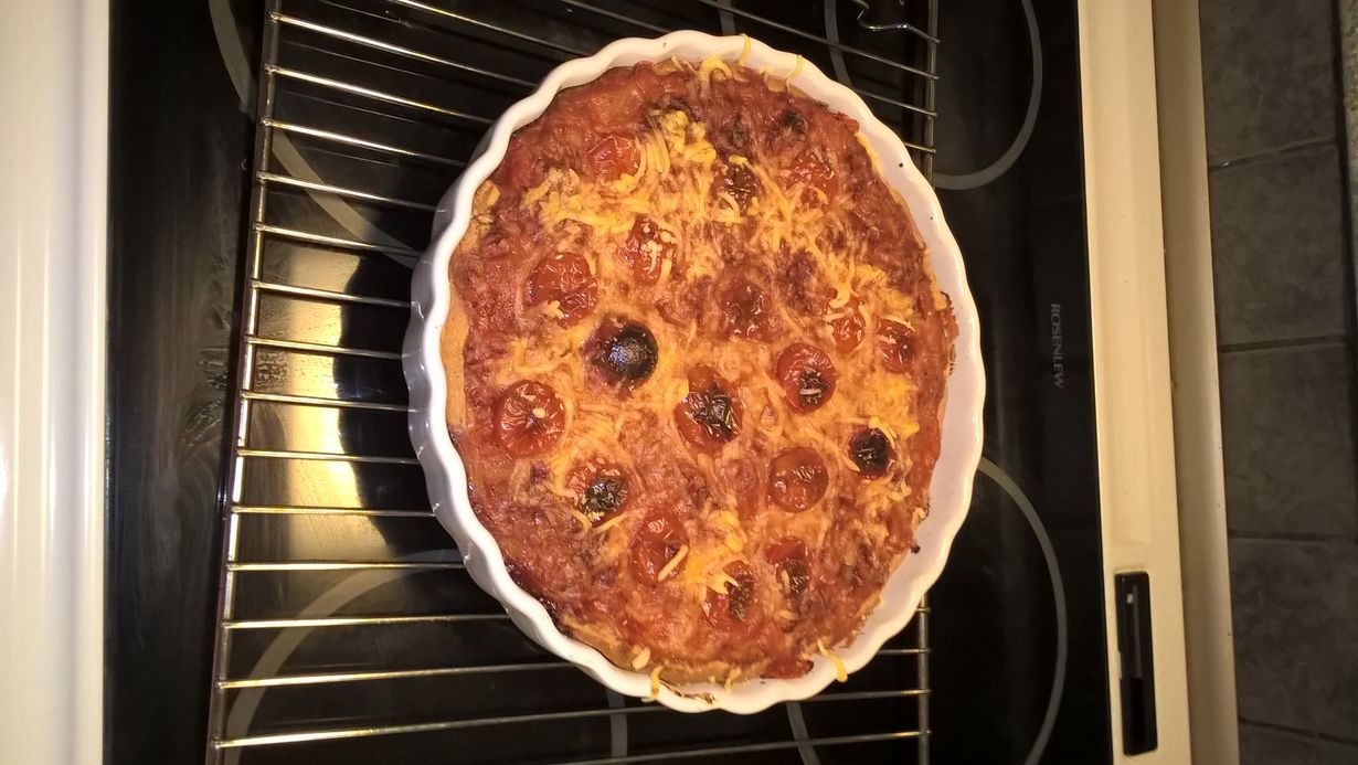 Tämä pizzapiiras pelastaa kun yllätys vieraat saapuvat. Valmis pohja pakkasesta. Jauhelihan ja pekonin ruskistus -joukkoon mausteet ja tomaattimurska. Kastike pohjan päälle ja pinnalle muutama halkaistu kirsikka tomaatti ja juustoraaste. Koko komeus uuniin 200 astetta ja puolisen tuntia