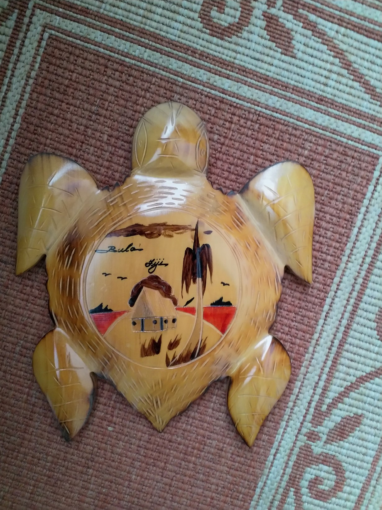 Tämä kilpikonna oli tuliainen miehen (silloin poikaystävä) mummulle. Hän ei itse ollut matkustanut juurikaan, mutta keräsi asuntonsa seinälle matkamuistolautasia. Kilpikonna palasi meille mummun kuoltua.