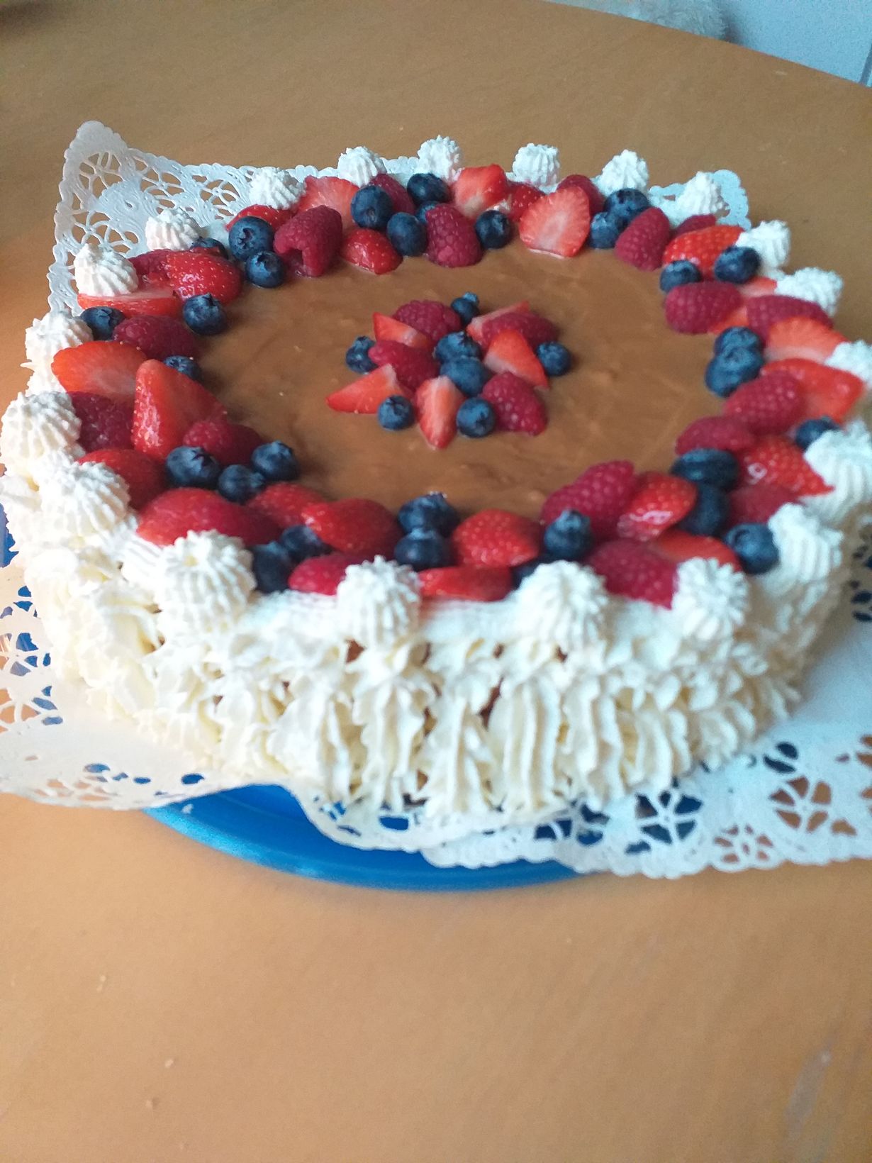 Miehen syntymäpäivien kunniaksi leivoin omalla reseptillä herkullisen kinuskikakun, jossa oli vadelmakreemitäyte, sekä koristeena tuoreita marjoja.