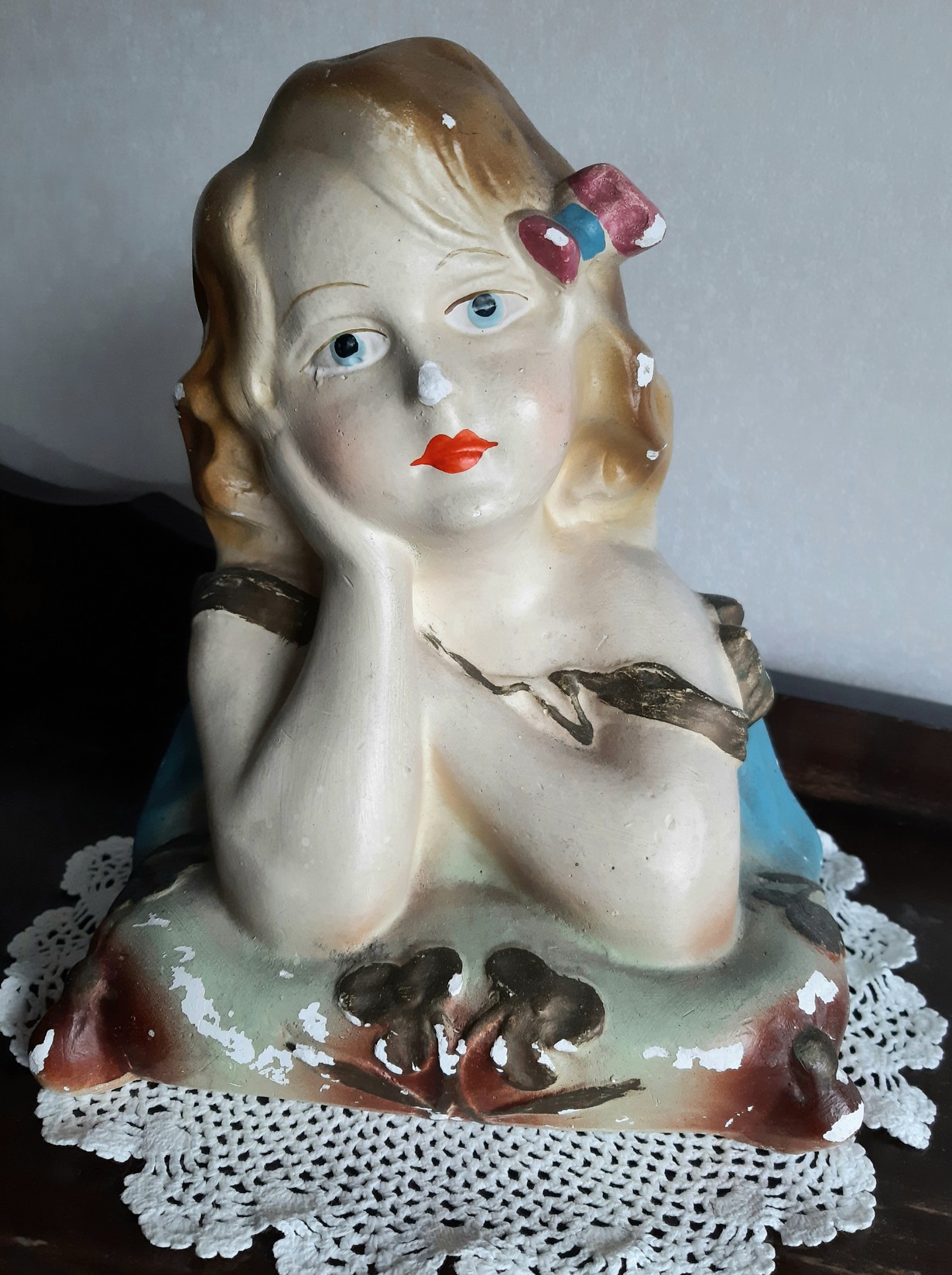 Lähetä kuvakisaan kuva kirpputorilöydöstäsi - voita Familonin peitto ja tyyny! Kipsityttö Mökin mummo 9.7.2022 klo 9:00 Puumalassa kirpparilöytö, Ihana haaveileva tyttönen.