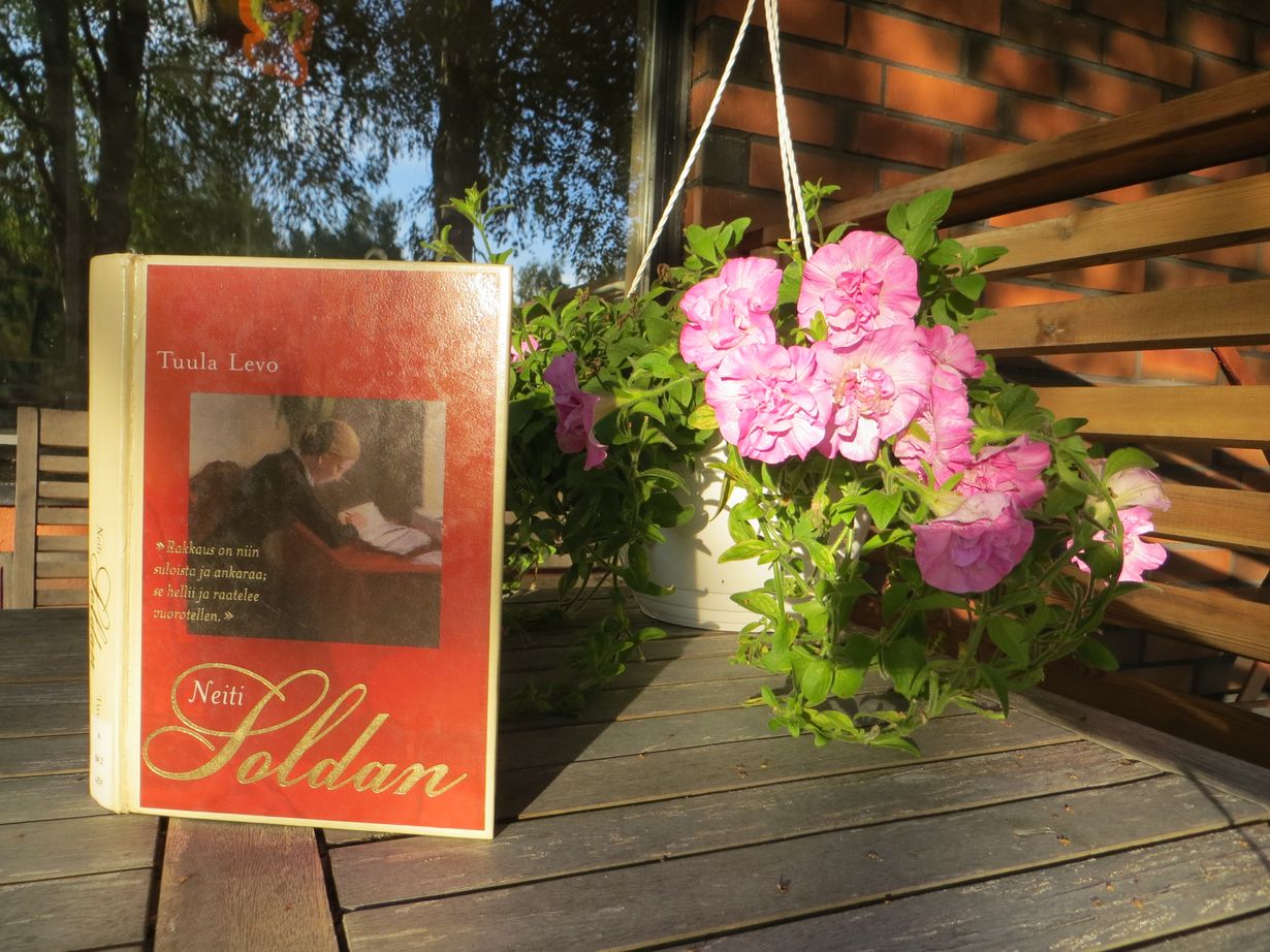 Luen juuri nyt Tuula Levon kirjoittamaa kirjaa "Neiti Soldan". Se kertoo Juhani Ahon kälystä Tilly Soldanista. Kirja imaisee niin voimakkaasti mukaansa, että kaikki ympärillä unohtuu. Terassilla on mukava lukea syysauringon luodessa vielä niin lämpimiä säteitään!