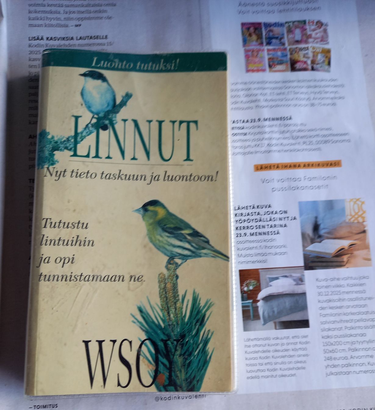 Lähetä kuvakisaan kuva kirjasta, joka on yöpöydälläsi nyt - voita Familonin pellavalakanat Kirja yöpöydälläni Lyyti 23.9.2025 klo 14:53 Illalla selaan usein lintukirjaa, kesäaamuisin saan herätä lintujen lauluun.